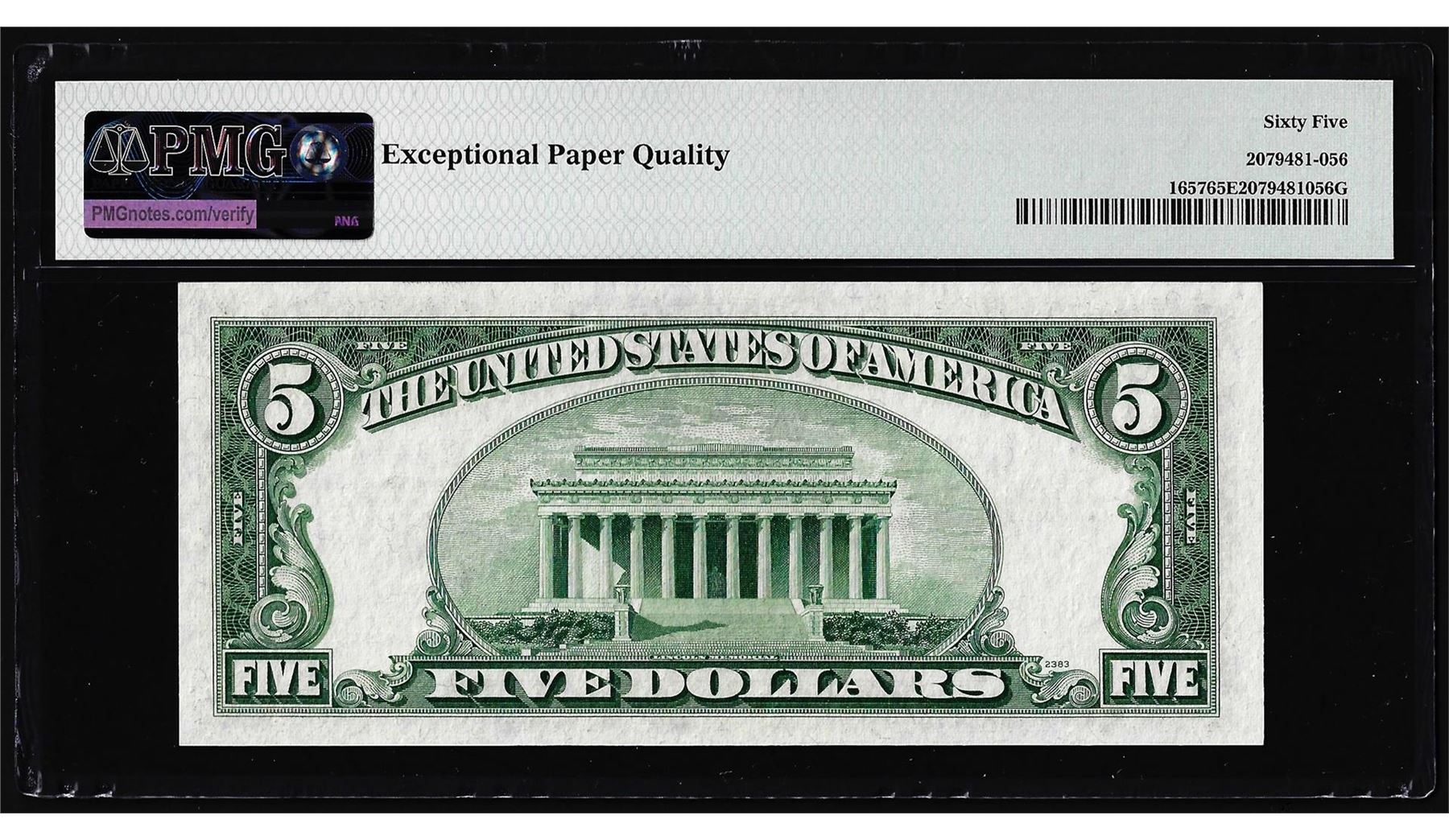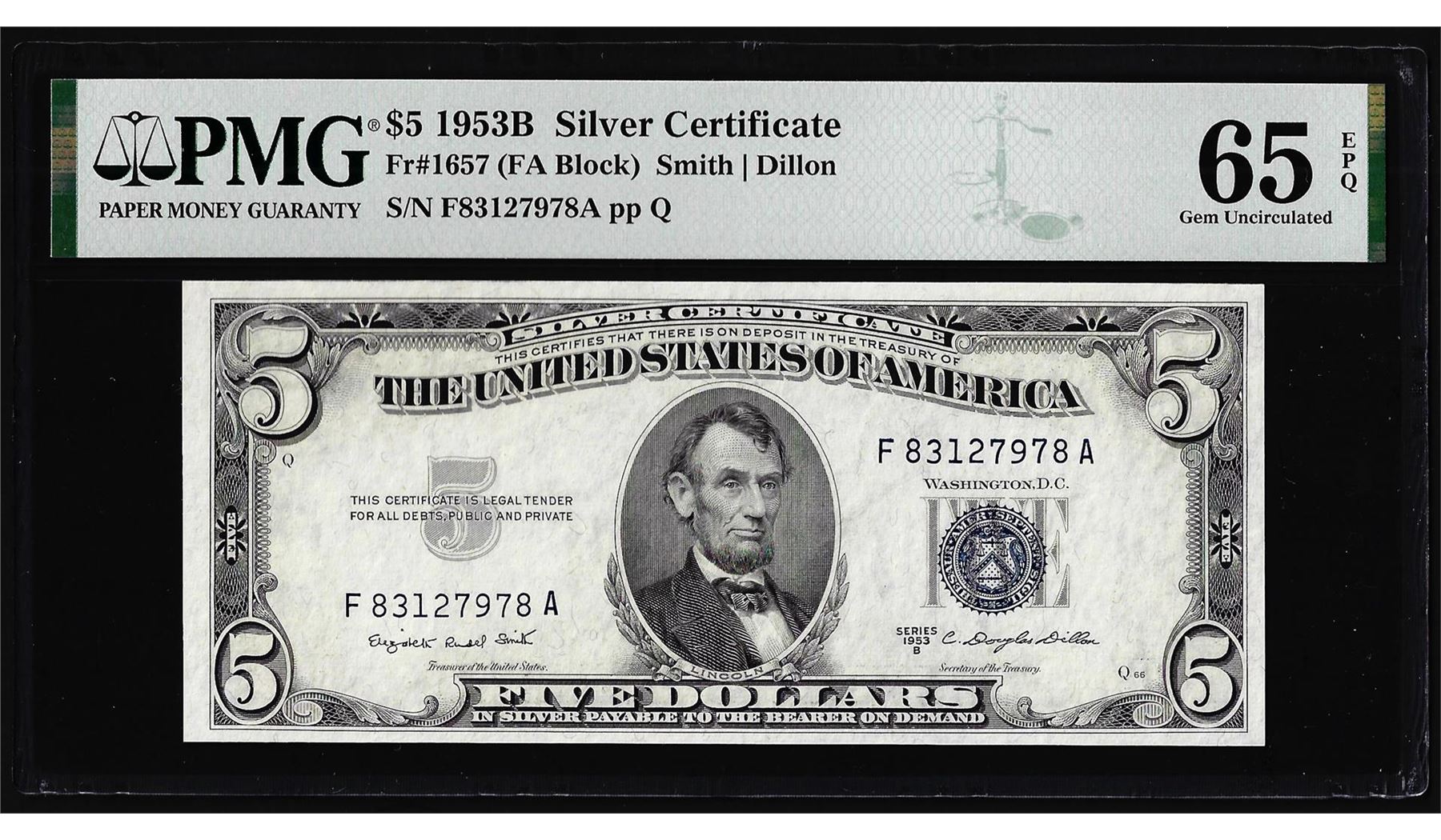 One 1953B $5 Silver Certificate Note Fr.1657 PMG Gem Uncirculated 65EPQ. PMG Certified.
