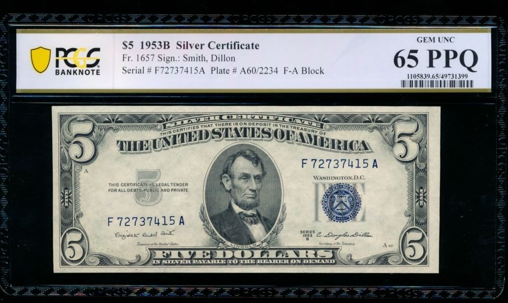 One 1953B $5 Silver Certificate PCGS 65PPQ.