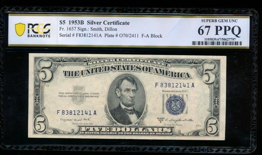 One 1953B $5 Silver Certificate PCGS 67PPQ.