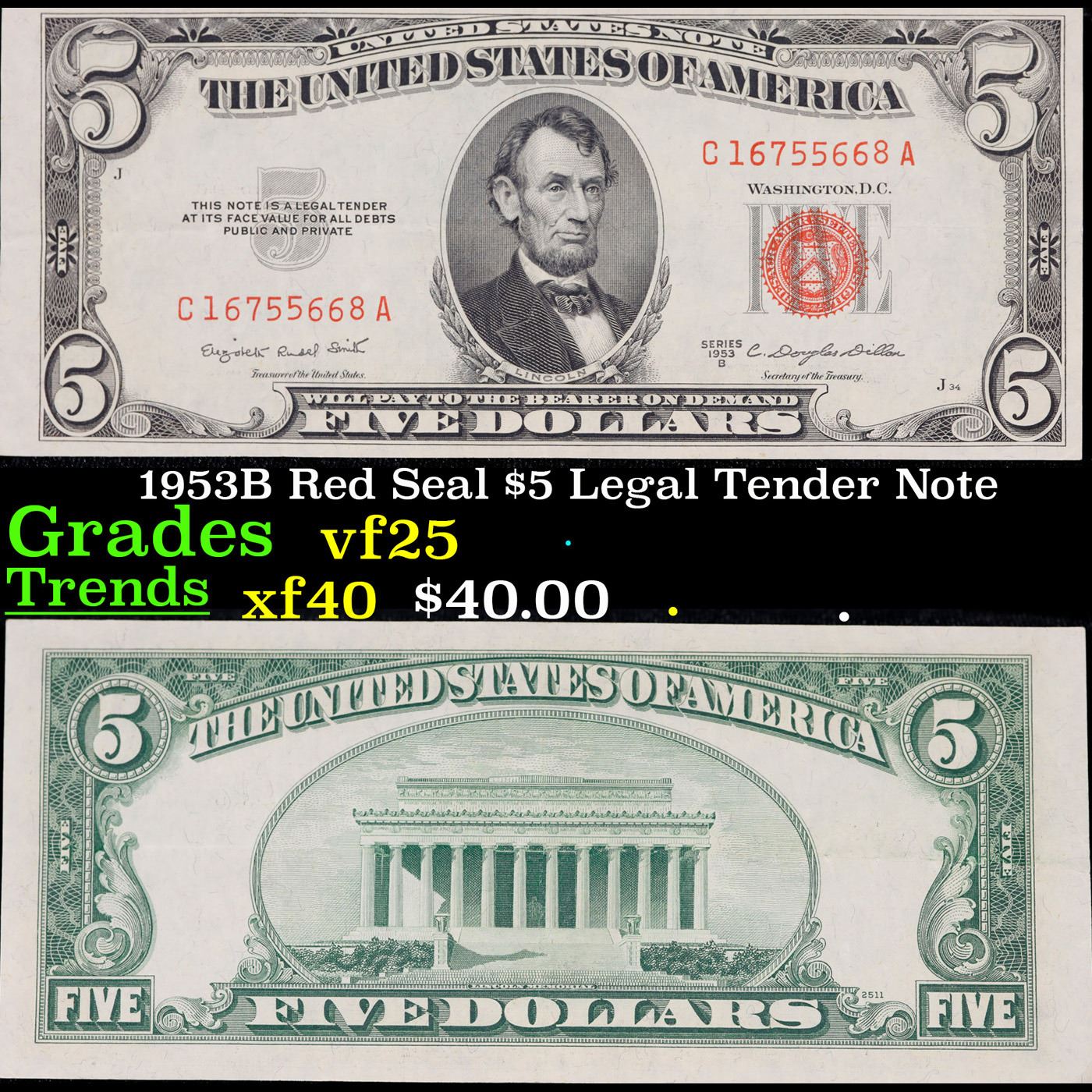 1953B Red Seal $5 Legal Tender Note Grades vf+.