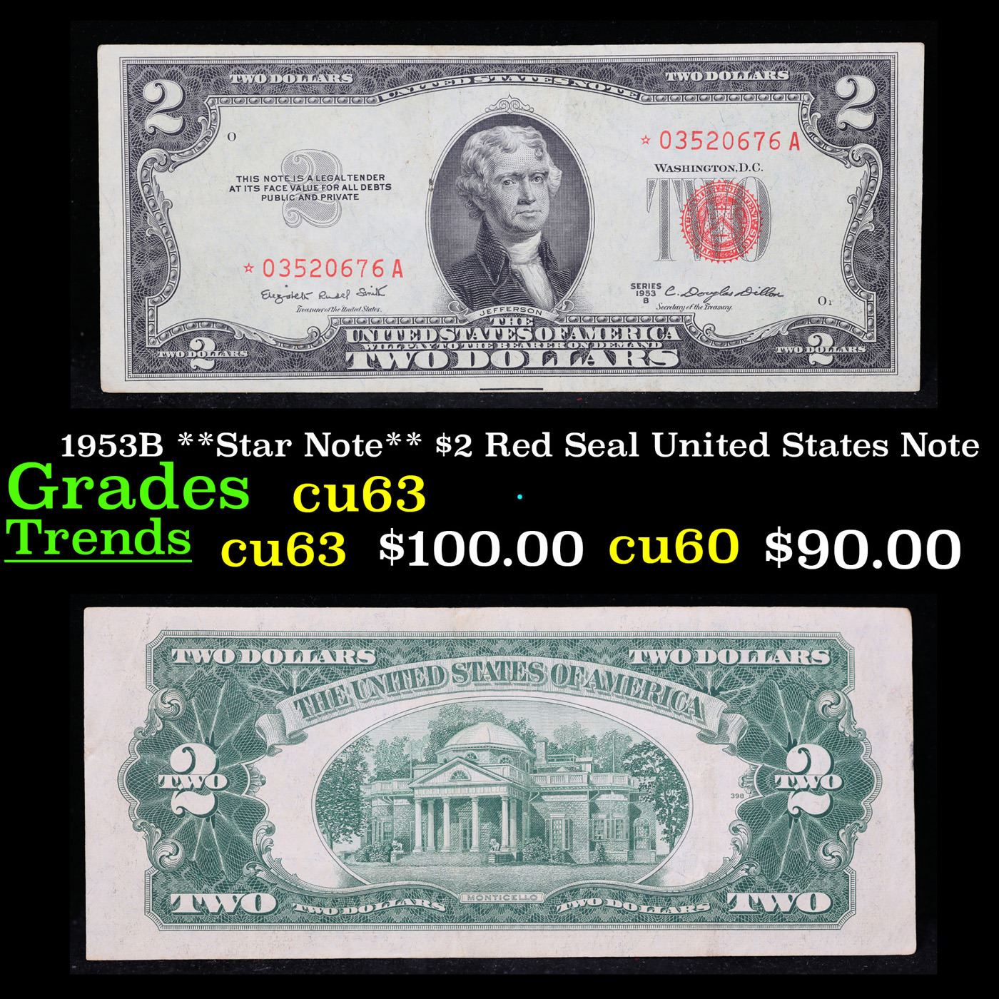 1953B **Star Note** $2 Red Seal United States Note Grades Select CU. When notes are discovered that have been printed incorrectly (such as having the serial numbers upside down, etc.) the misprinted "error notes" are replaced with star notes because no two bills within a certain series can be produced with the same serial number. They are used to maintain a correct count of notes in a serial number run. By their nature, star notes are more scarce than notes with standard serial numbers and as such are widely collected by numismatists. Some of the highest prices paid for modern (post-1928) U.S. banknotes have been for star notes.