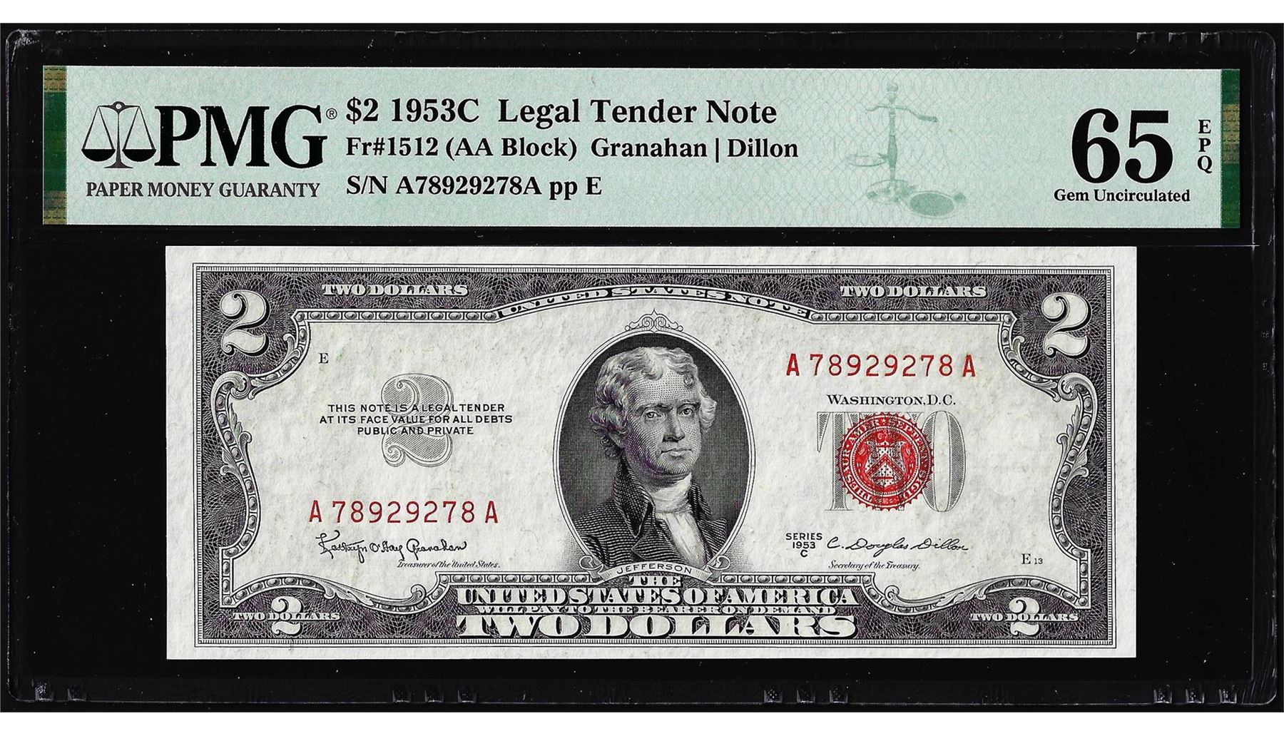 One 1953C $2 Legal Tender Note Fr.1512 PMG Gem Uncirculated 65. PMG Certified.