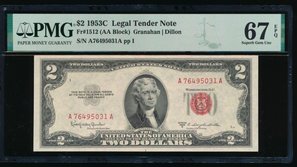 One 1953C $2 Legal Tender Note PMG 67EPQ.