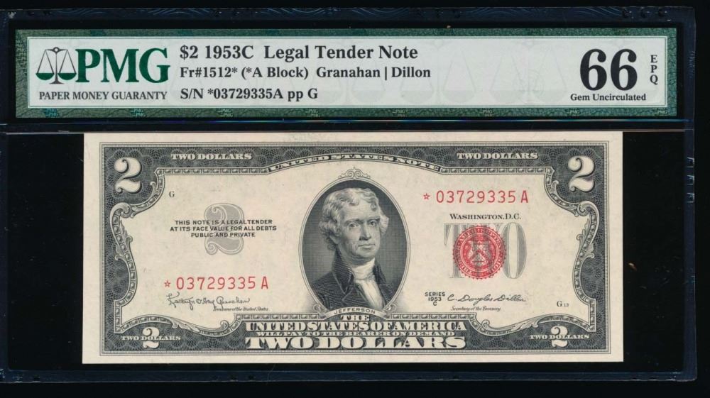 One 1953C $2 Legal Tender STAR Note PMG 66EPQ.