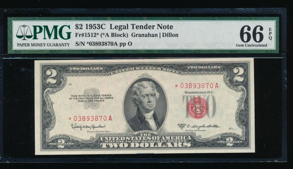 One 1953C $2 Legal Tender STAR Note PMG 66EPQ.