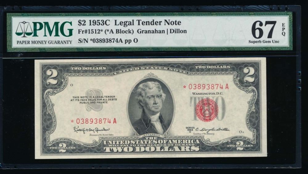 One 1953C $2 Legal Tender STAR Note PMG 67EPQ.
