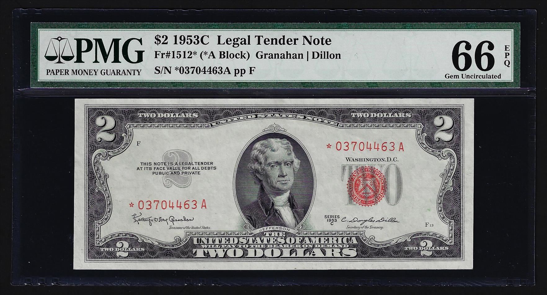 One 1953C $2 Legal Tender STAR Note PMG Gem Uncirculated 66EPQ. PMG Certified.