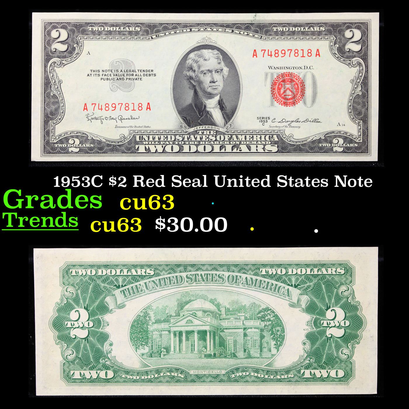 1953C $2 Red Seal United States Note Grades Select CU.