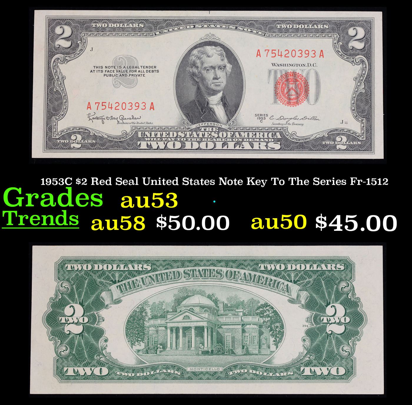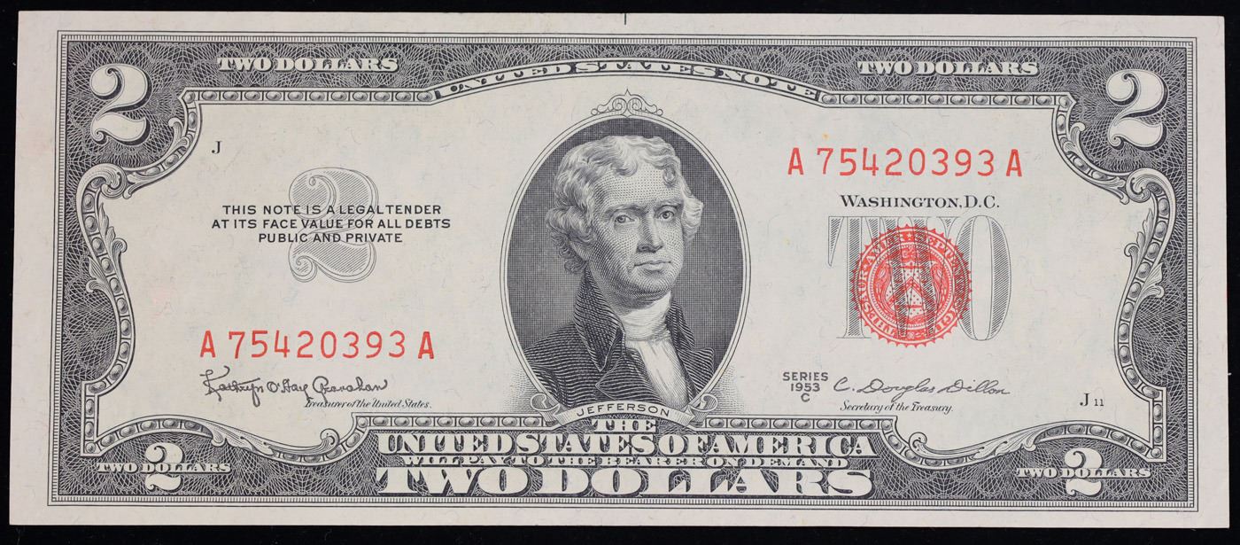 1953C $2 Red Seal United States Note Key To The Series Fr-1512 Grades Select AU. Out of about 70 Million 1953 $2 Notes Printed Only About 7% were 1953C Notes Making it the lowest mintage in the series and The Key To The Series