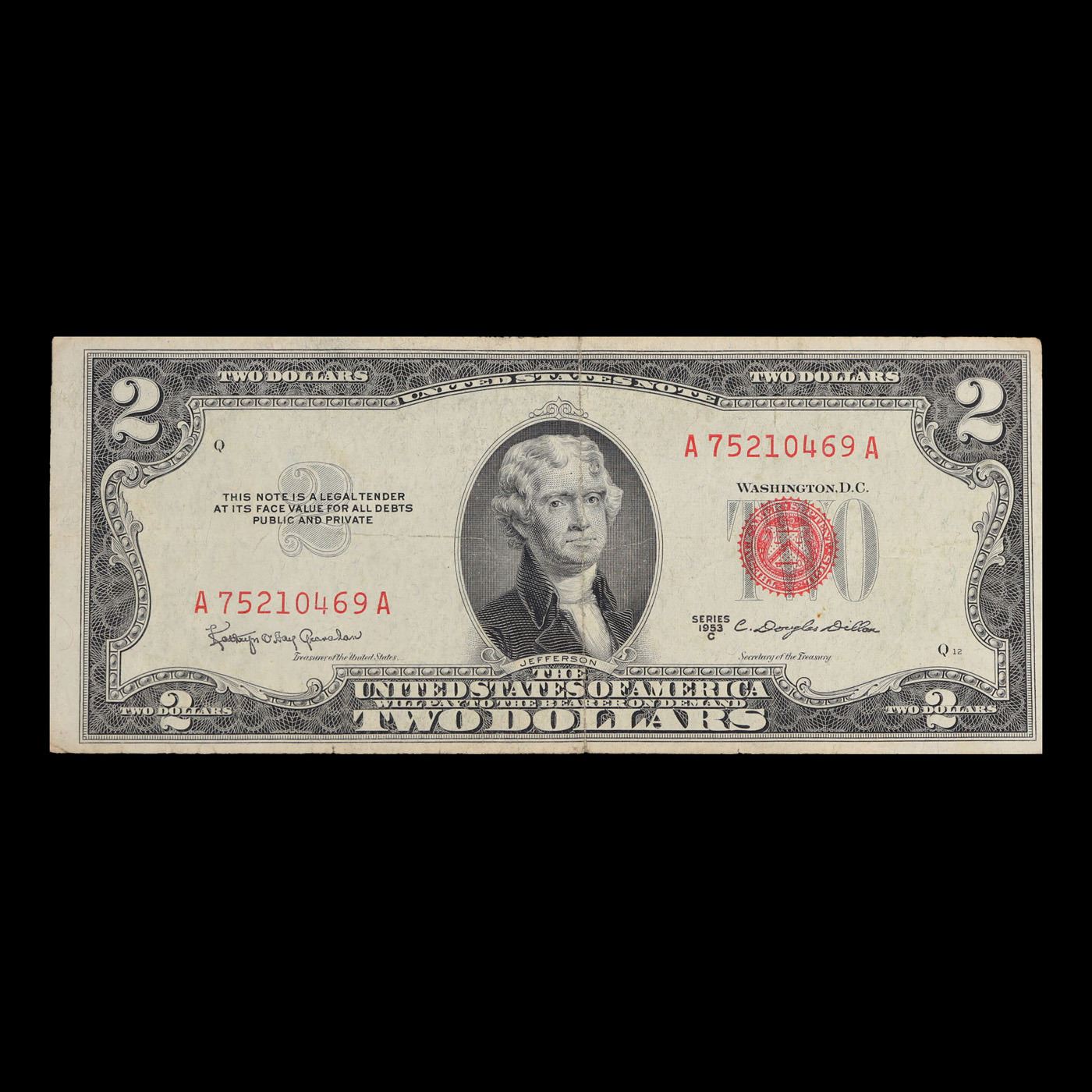 1953C $2 Red Seal United States Note Key To The Series Fr-1512 Grades vf++. Out of about 70 Million 1953 $2 Notes Printed Only About 7% were 1953C Notes Making it the lowest mintage in the series and The Key To The Series