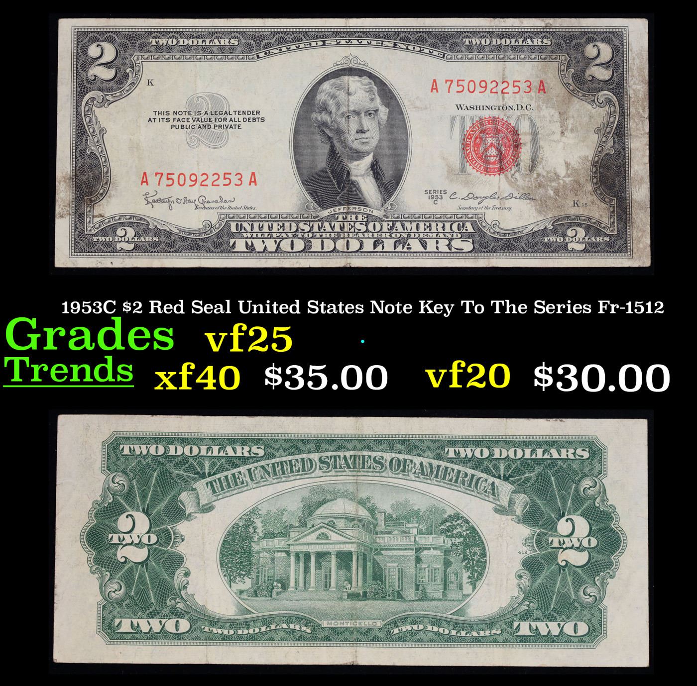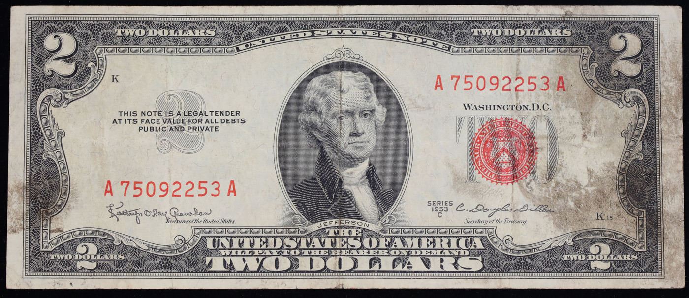1953C $2 Red Seal United States Note Key To The Series Fr-1512 Grades vf+. Out of about 70 Million 1953 $2 Notes Printed Only About 7% were 1953C Notes Making it the lowest mintage in the series and The Key To The Series