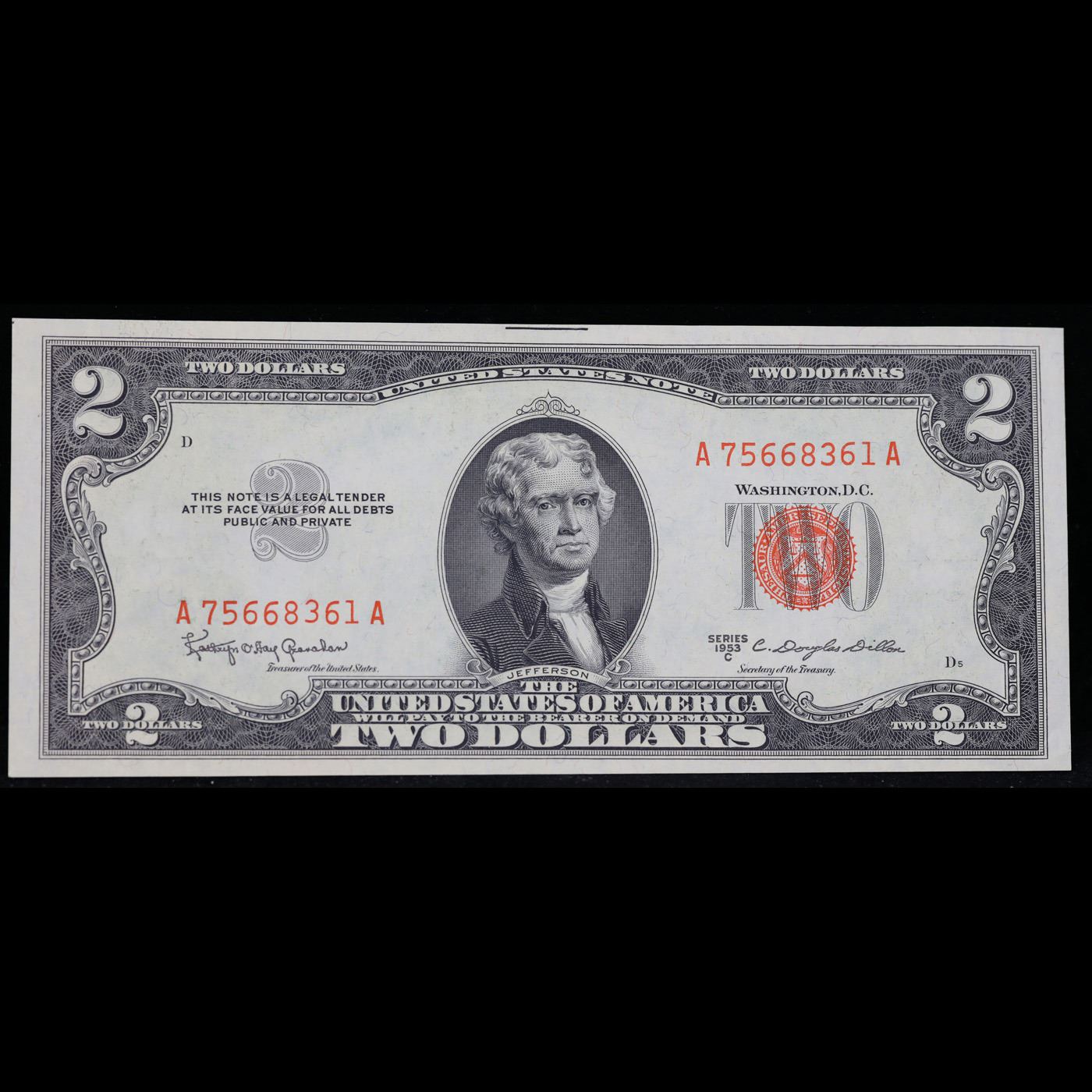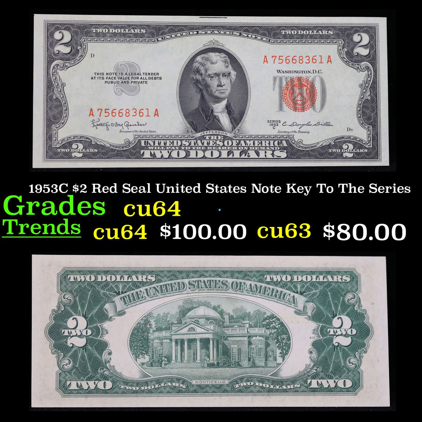 1953C $2 Red Seal United States Note Key To The Series Grades Choice CU. Out of about 70 Million 1953 $2 Notes Printed Only About 7% were 1953C Notes Making it the lowest mintage in the series and The Key To The Series