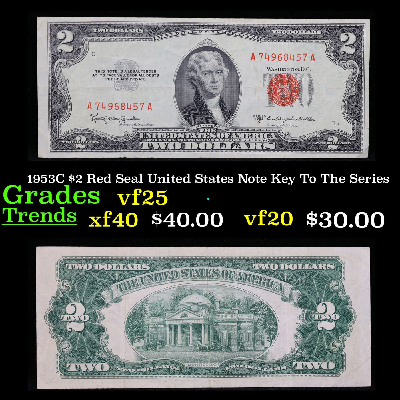 1953C $2 Red Seal United States Note Key To The Series Grades vf+. Out of about 70 Million 1953 $2 Notes Printed Only About 7% were 1953C Notes Making it the lowest mintage in the series and The Key To The Series