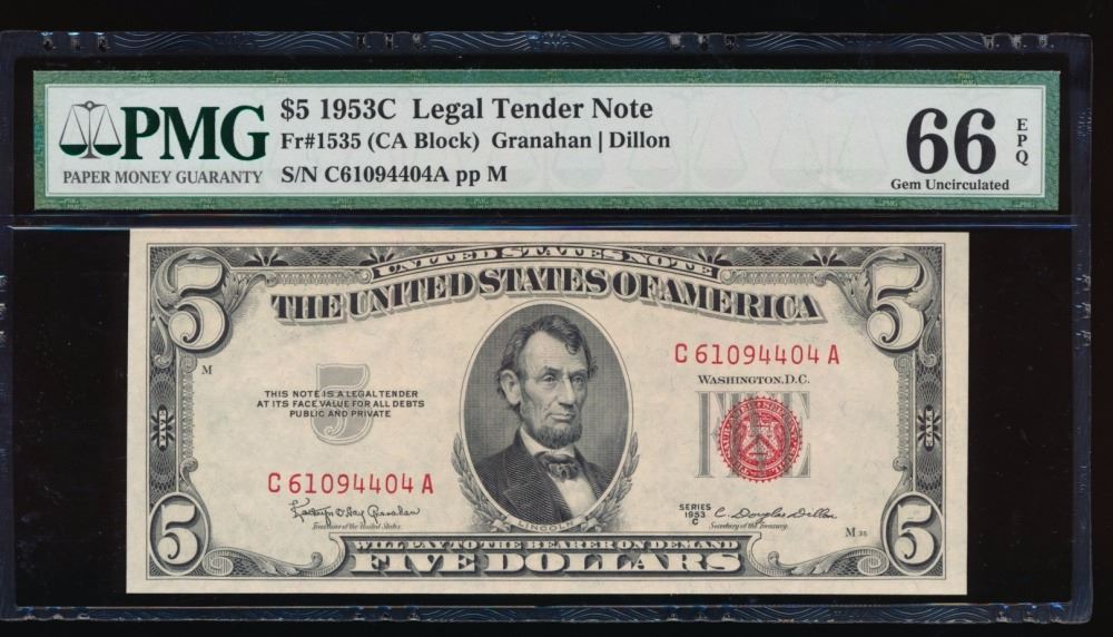 One 1953C $5 Legal Tender Note PMG 66EPQ.