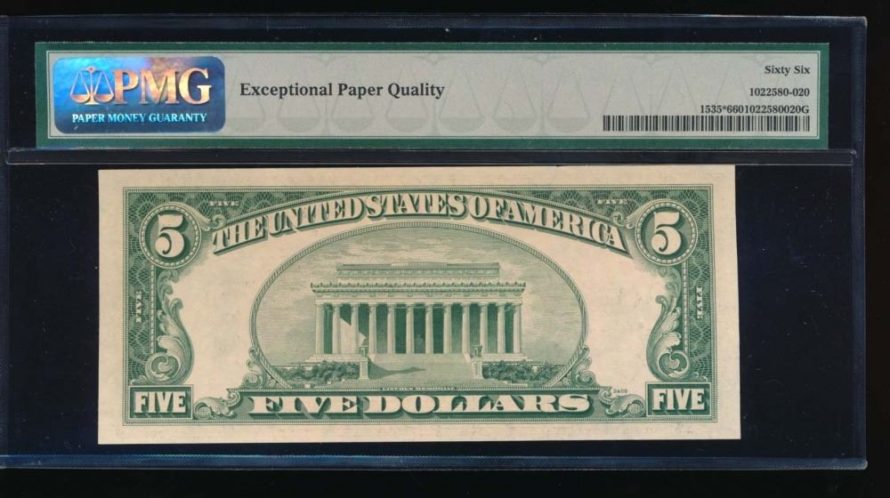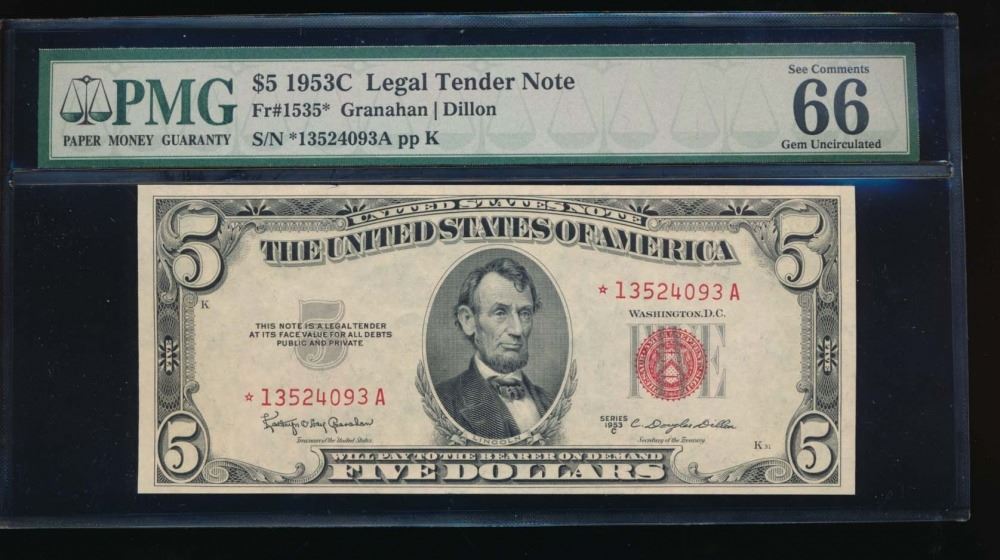 One 1953C $5 Legal Tender Star Note PMG 66.