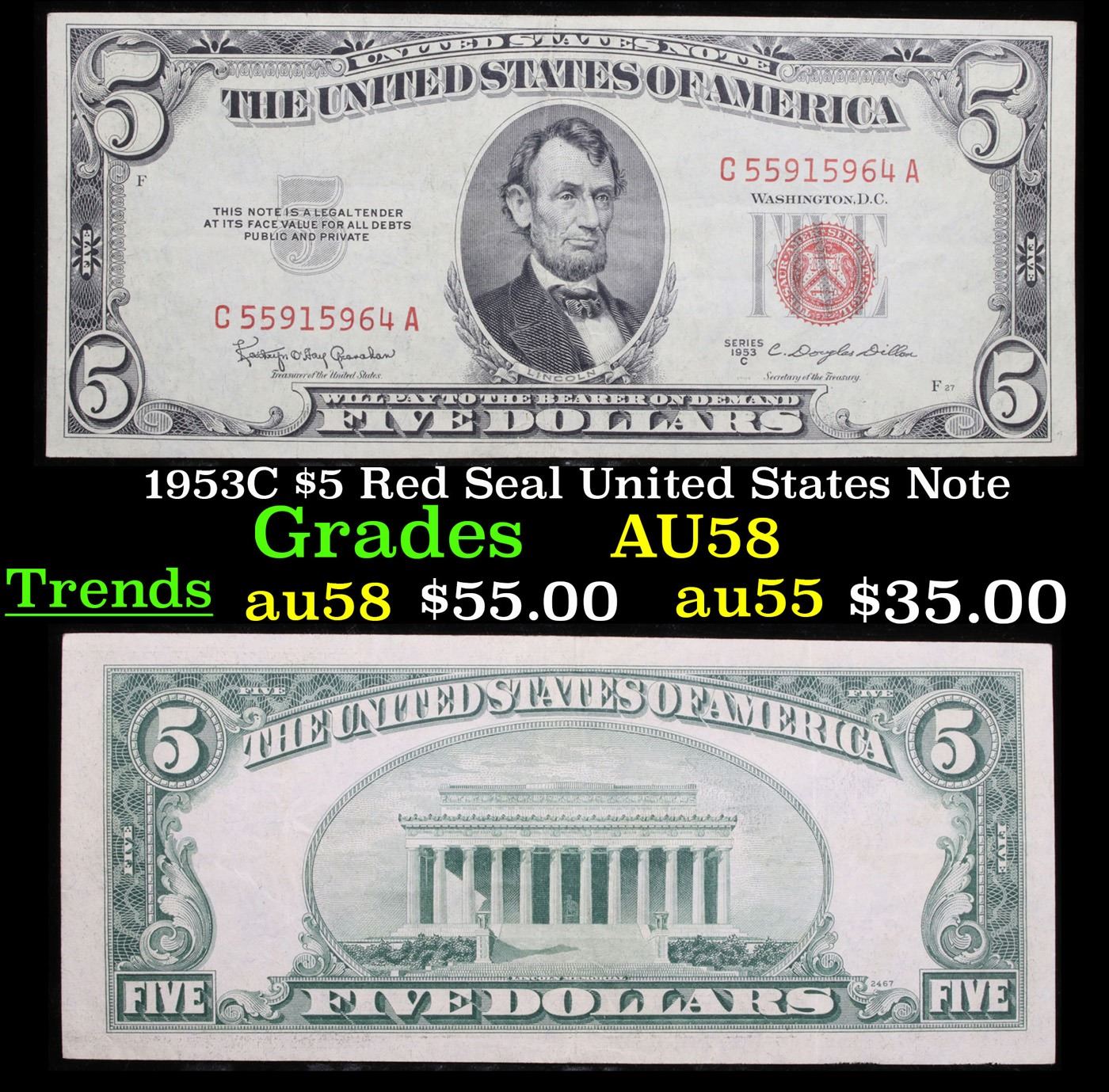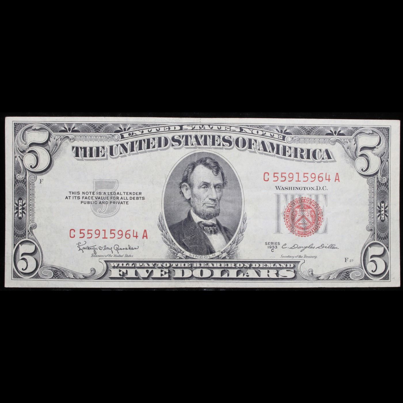 1953C $5 Red Seal United States Note Grades Choice AU/BU Slider. Very Near Unc 1953 red seal five dollar bills come in four different varieties. There are series of 1953, series of 1953A, series of 1953B, and series of 1953C. All of these five dollar bills are worth about $6 each in average circulated condition. If the 1953 red seal fives are uncirculated then something closer to $15 will be more accurate. The only difference between the four notes is the signatures. The first name is the Treasurer of The United States and the second name is the Secretary of The Treasury: Series of 1953: Ivy Baker Priest and G.M. Humphrey (120,880,000 printed)Series of 1953 A: Ivy Baker Priest and Robert B. Anderson (90,280,000 printed) Series of 1953 B: Elizabeth Rudel Smith and C. Douglas Dillon (44,640,000 printed) Series of 1953 C: Kathryn O’Hay Granahan and C. Douglas Dillon (8,640,000 printed)