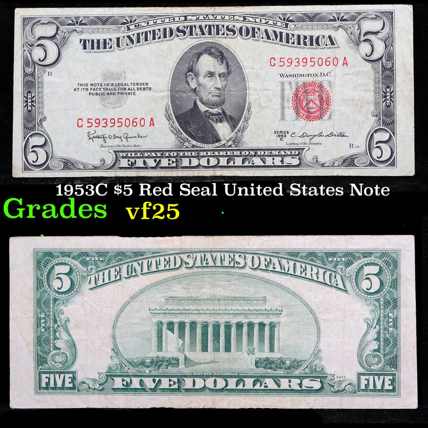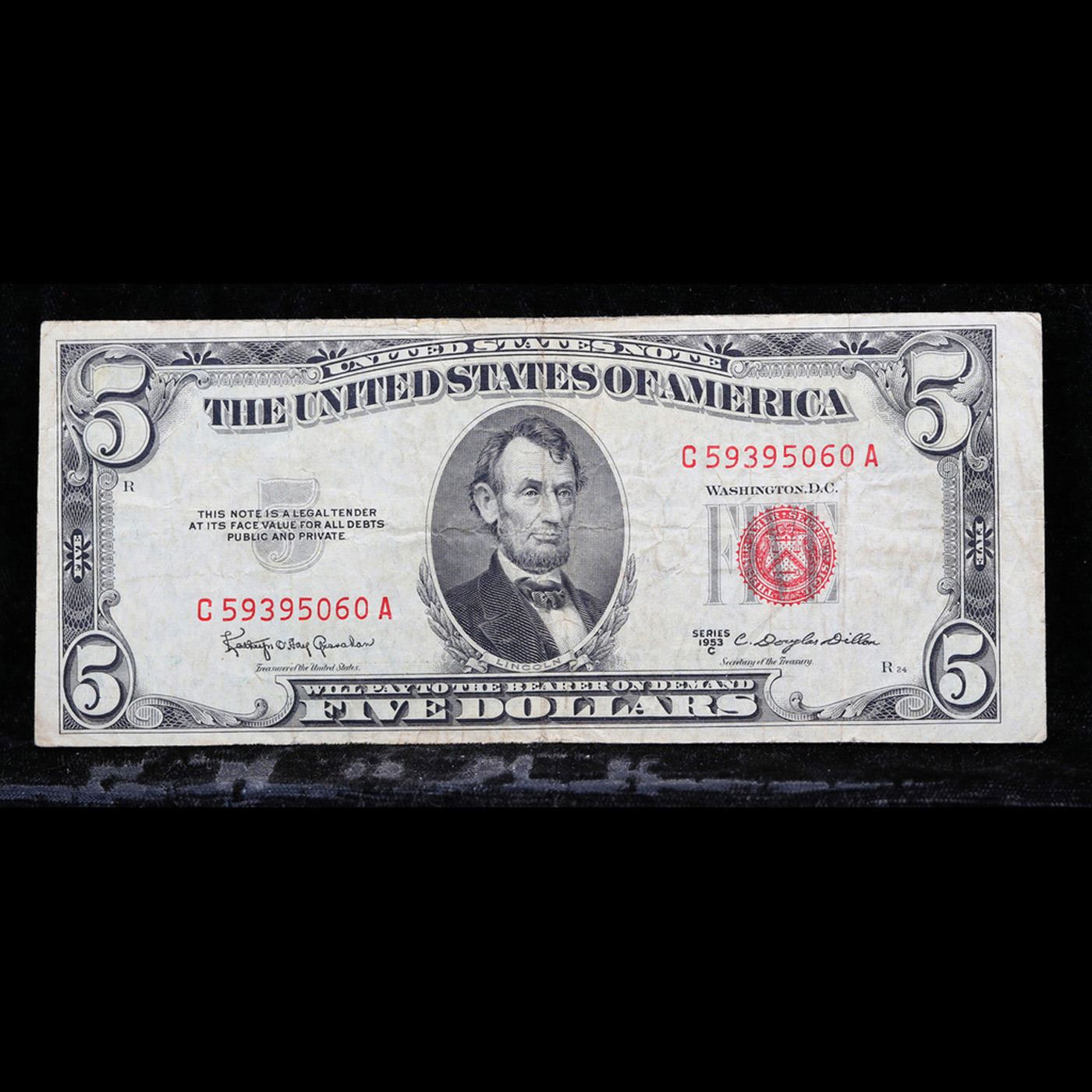 1953C $5 Red Seal United States Note Grades vf+.