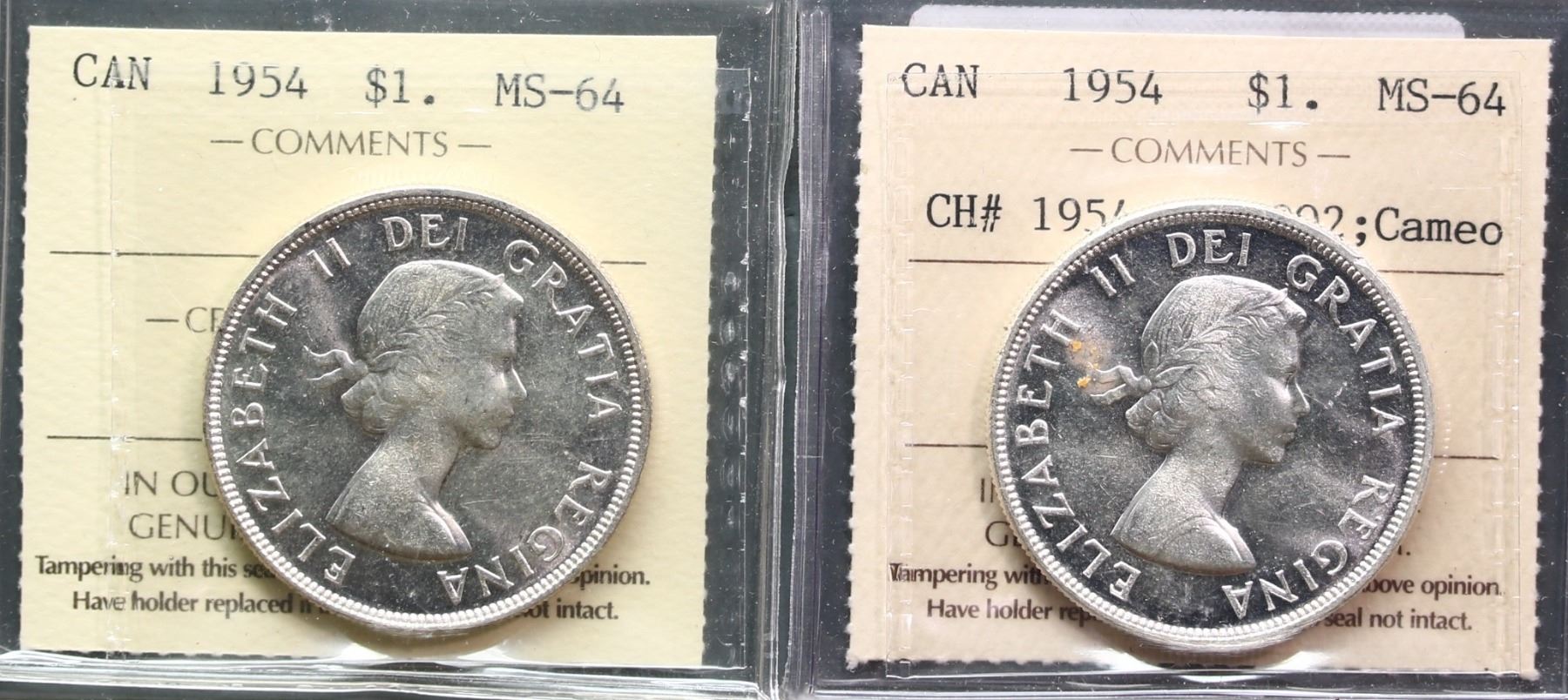 1954 $1, 1954 CH# 1954 Rev 002 Cameo, both ICCS Choice Mint State-64.