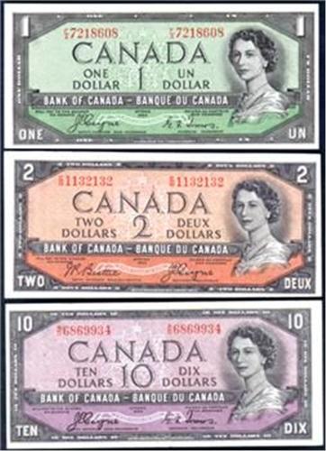 1954 One Dollar Devil’s Face Coyne-Towers, BC-29a, serial number F/A7218608, AU. Plus 1954 Two Dollars Devil’s Face Beattie-Coyne, BC-30b, serial number E/B1132132, EF and 1954 Devil’s Face Ten Dollars Coyne-Towers BC-32a serial number A/D6869934, EF