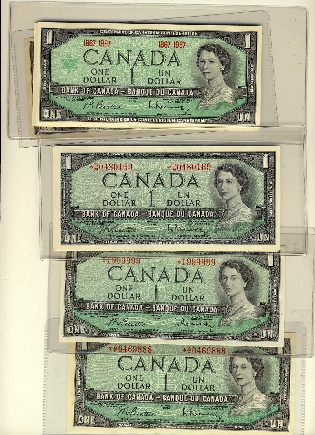 1954 $1 37bA #*IF, *BM(5), 1954 $1 BC-37b #1999999 & 1867-1967 $1 15 UNC notes and one circ. 1954 issues grade UNC except *AF example.