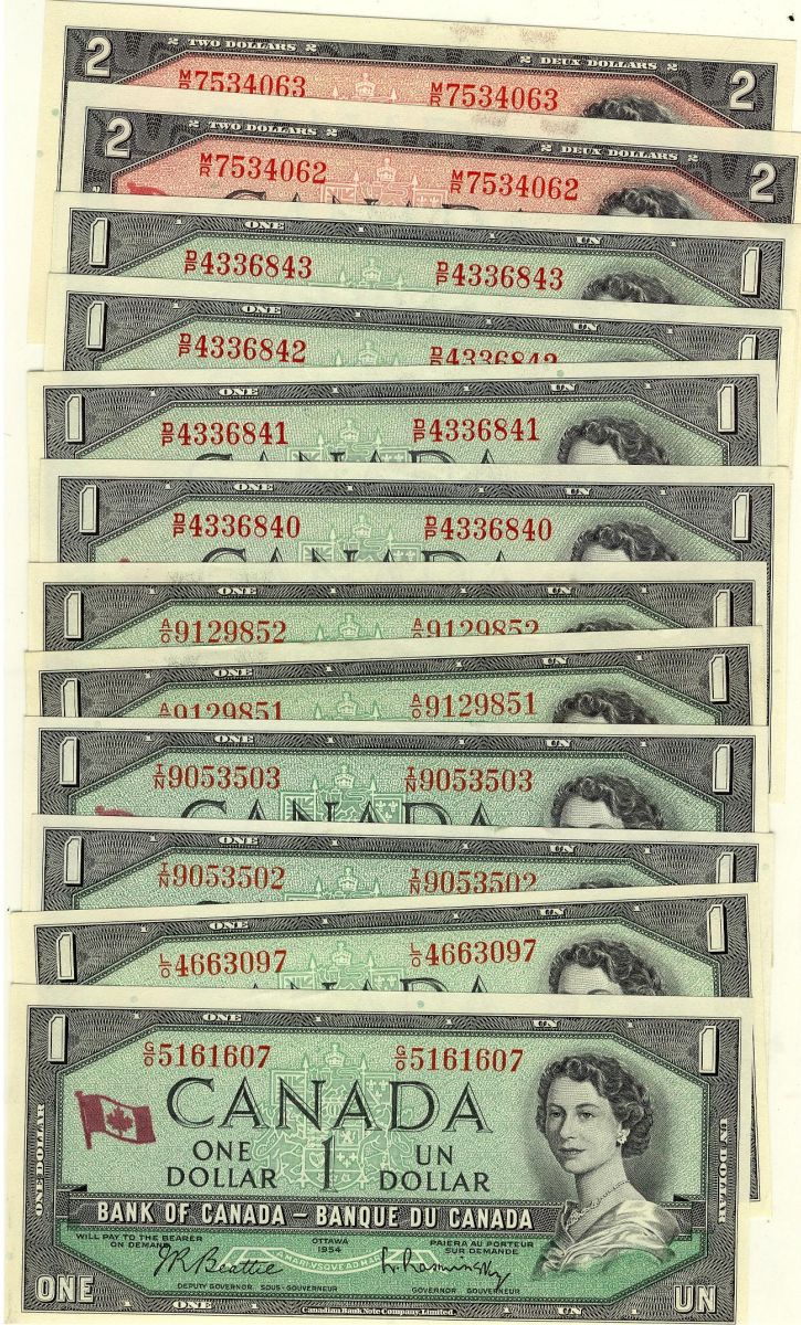 1954 $1 (9) 1954 $2 (2), BC-37b and BC-38b, all notes bear a red Canadian flag. All Unc.