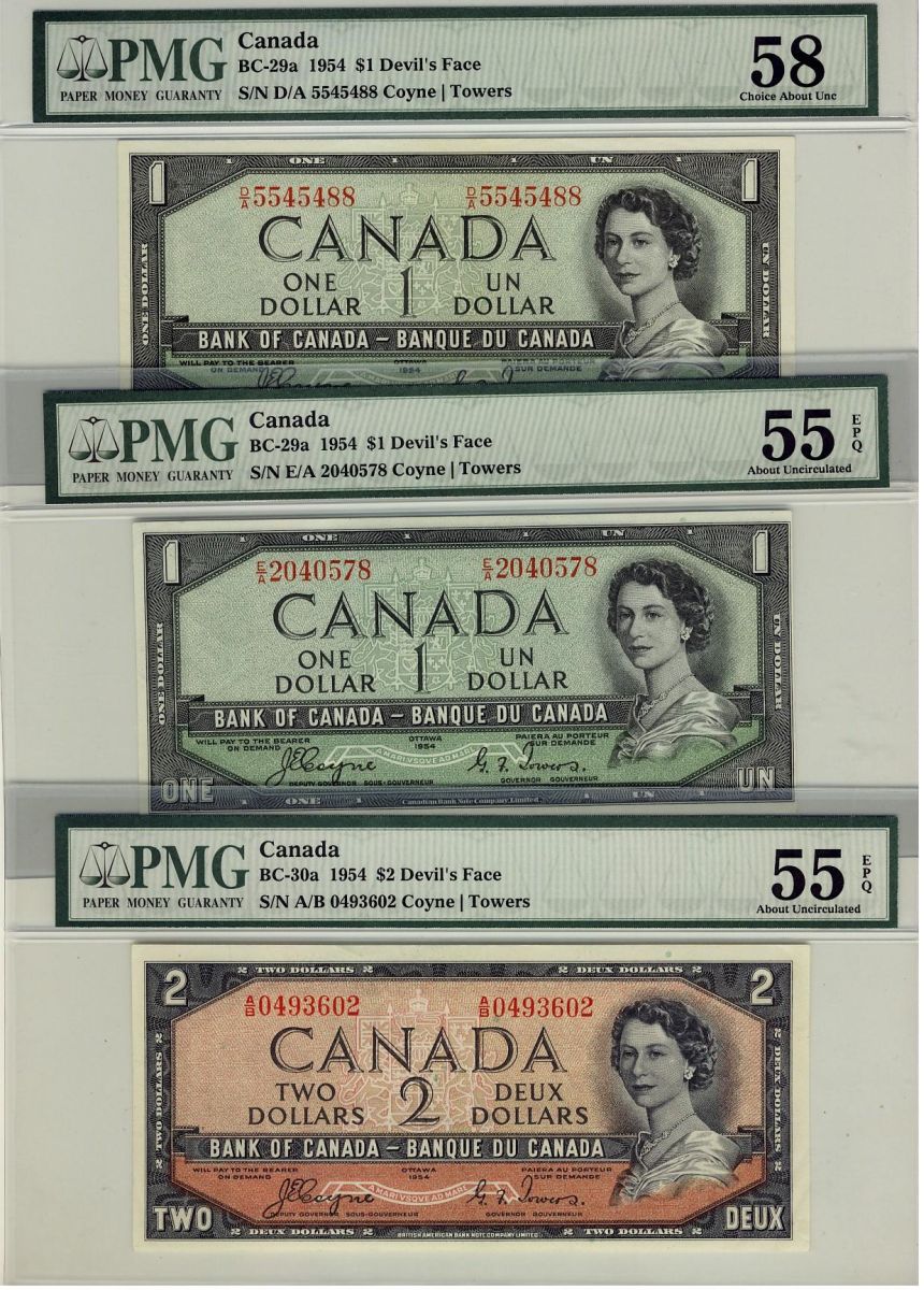 1954 $1 BC-29a(2) & $2 BC-30a. Lot of 3 notes all PMG graded AU55 except 1 x $1 which grades AU58.