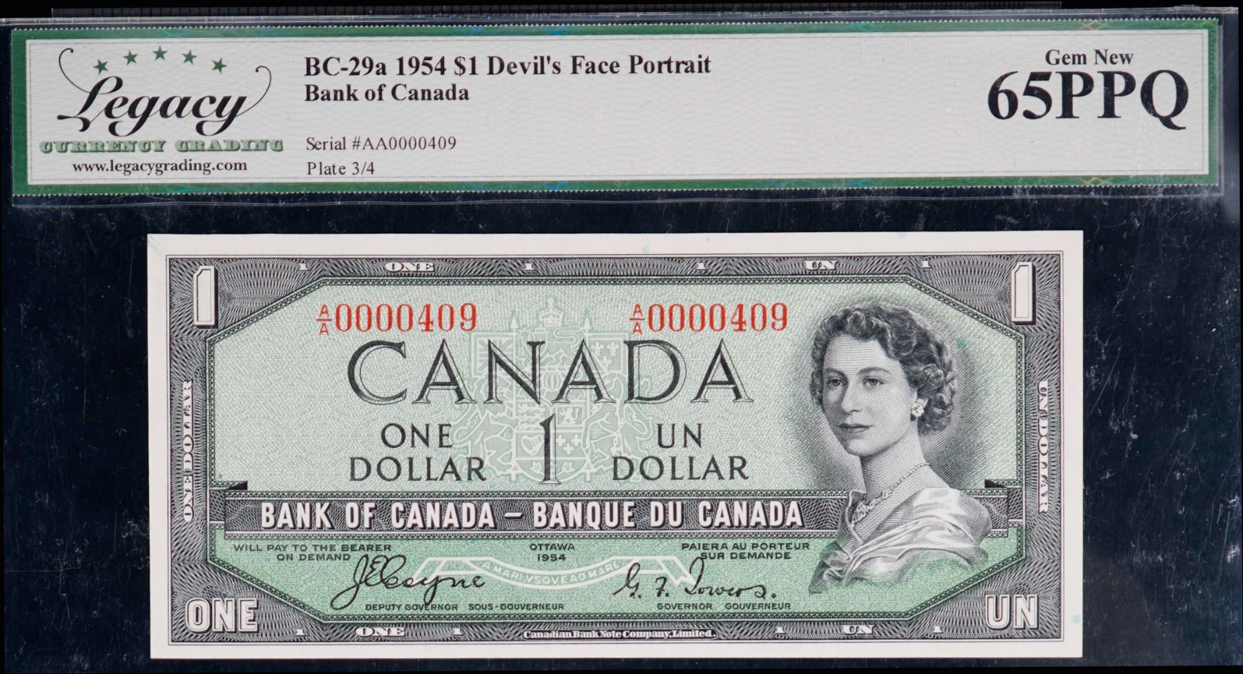 1954 $1 BC-29a #AA0000409, Legacy Gem Uncirculated-65PPQ. Low Serial number.