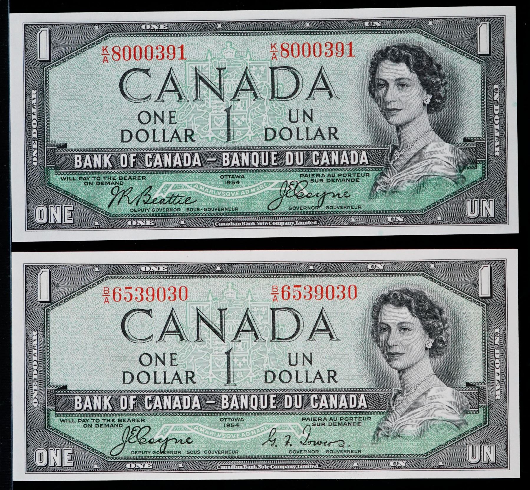 1954 $1 BC-29a #B/A6539030, BC-29b #K/A8000391, both UNC or better.