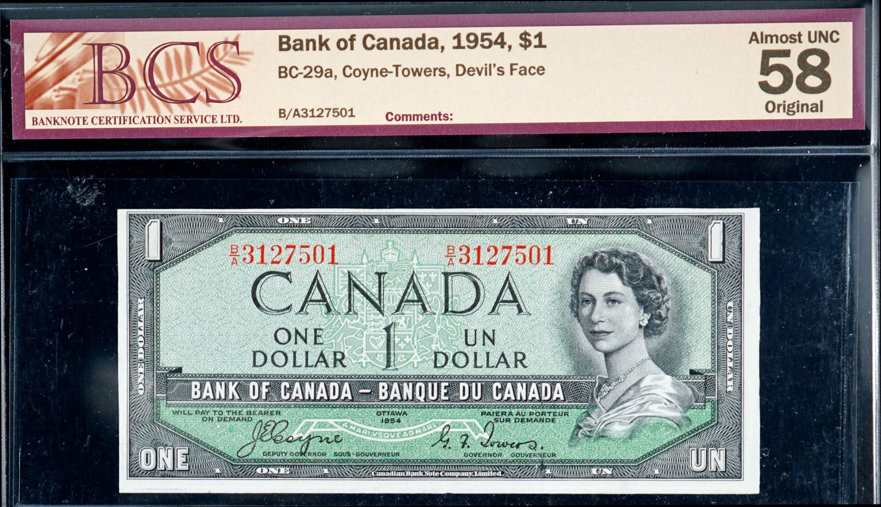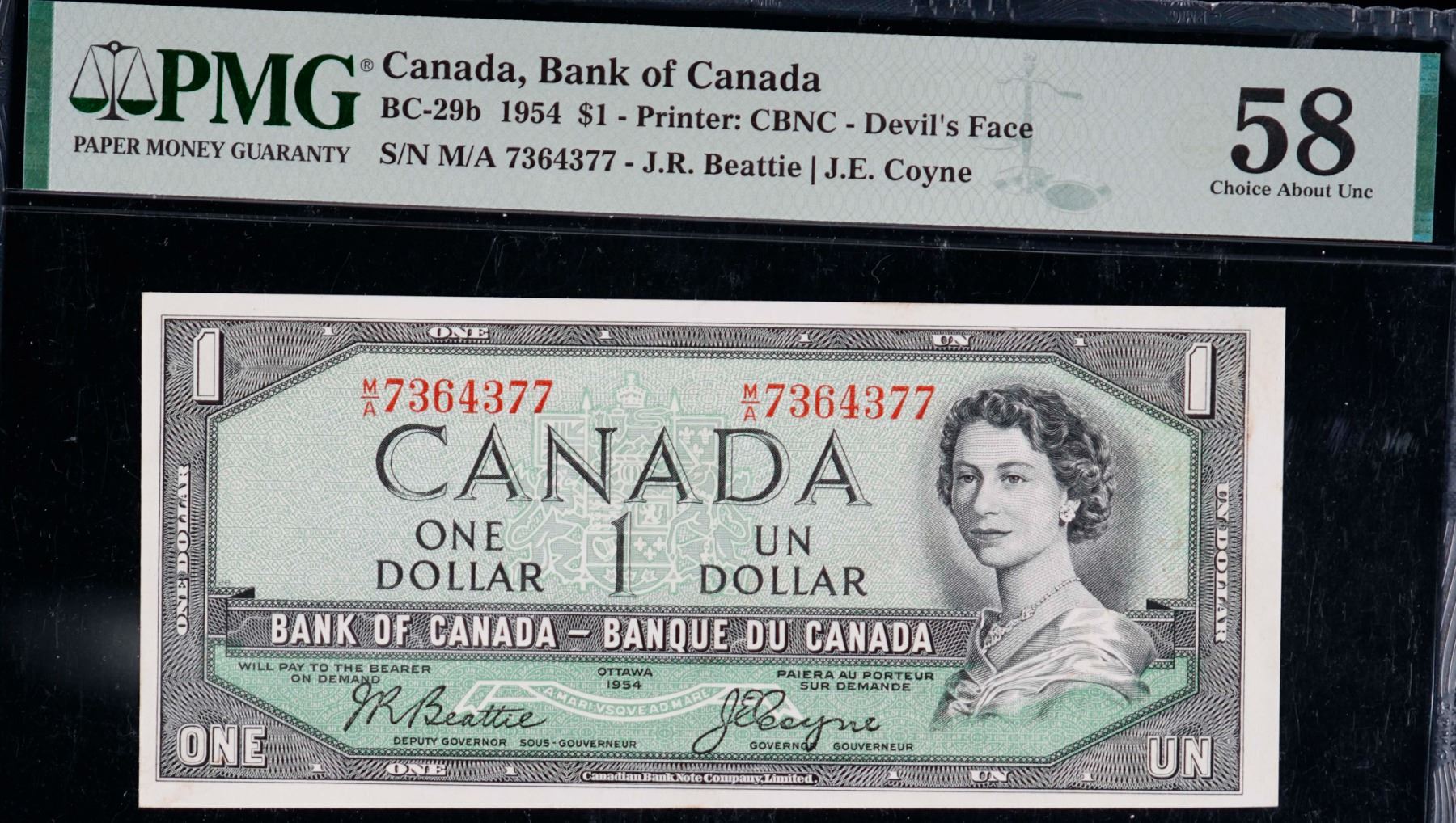 1954 $1 BC-29a, BC-29b. Both notes certified Choice About Uncirculated-58 devil's face