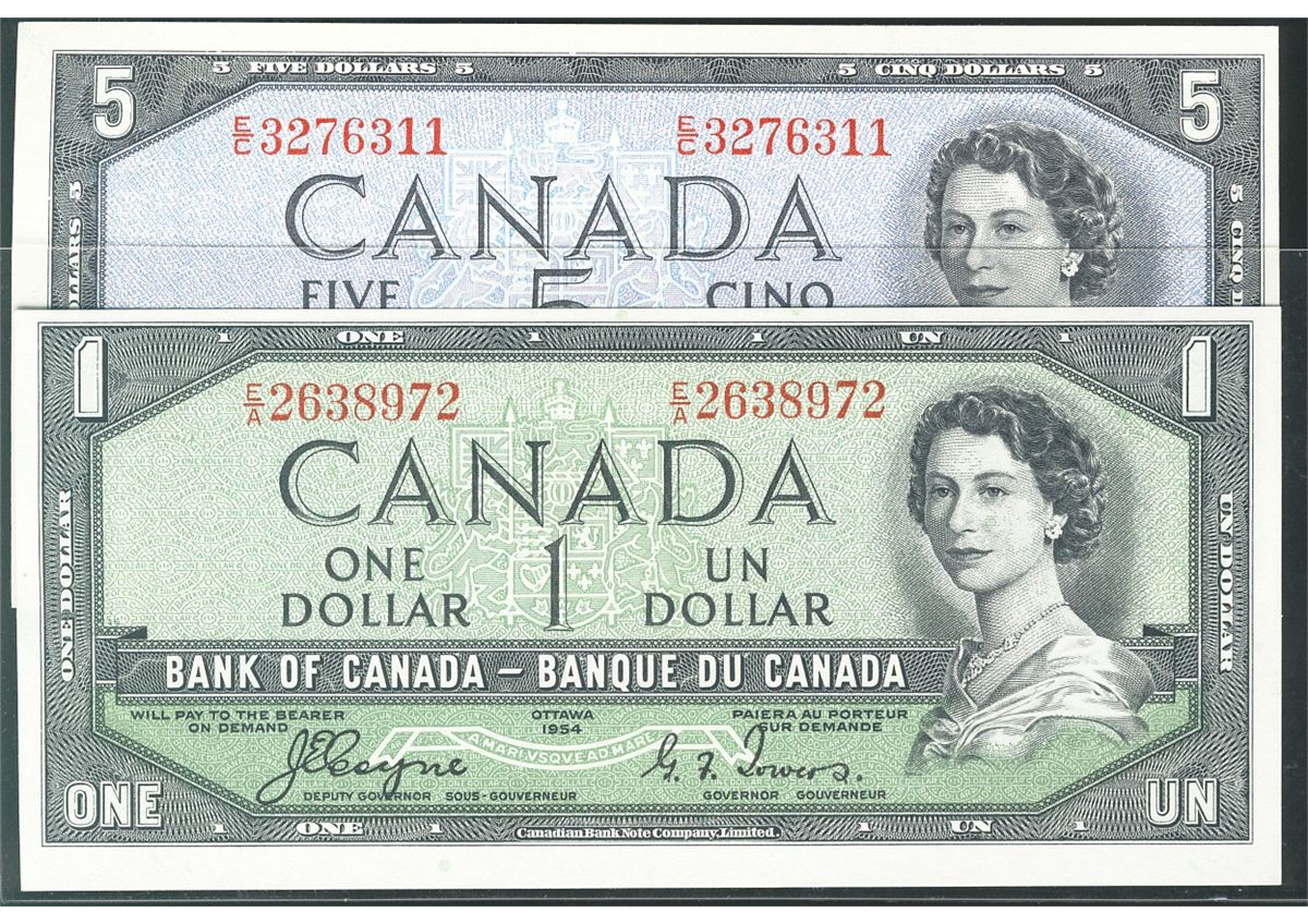 1954 $1 BC-29a #EA2638972 & $5 BC-31b #EC3276311. Lot of 2 notes EF/AU.