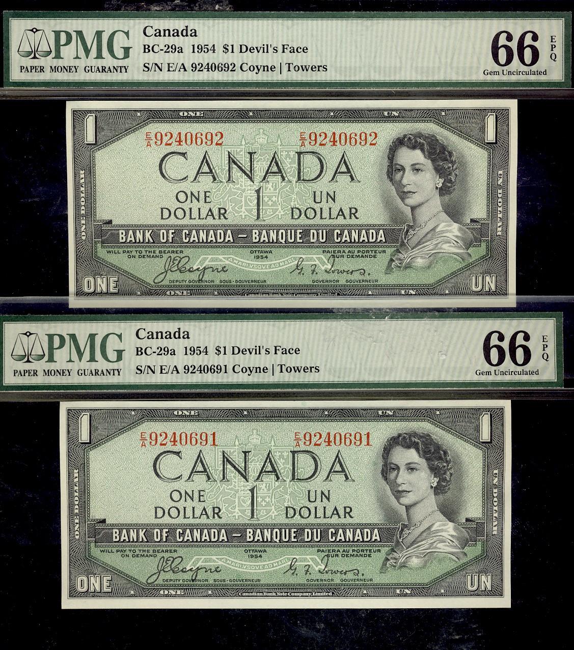 1954 $1 BC-29a #EA9240691/692 PMG Gem UNC66 EPQ. Lot of 2 consecutive notes.
