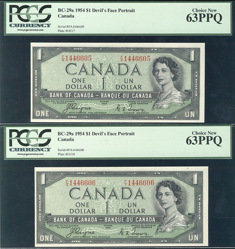 1954 $1 BC-29a #FA1446605/6606 PCGS CH UNC63PPQ. Lot of 2 consecutive notes.