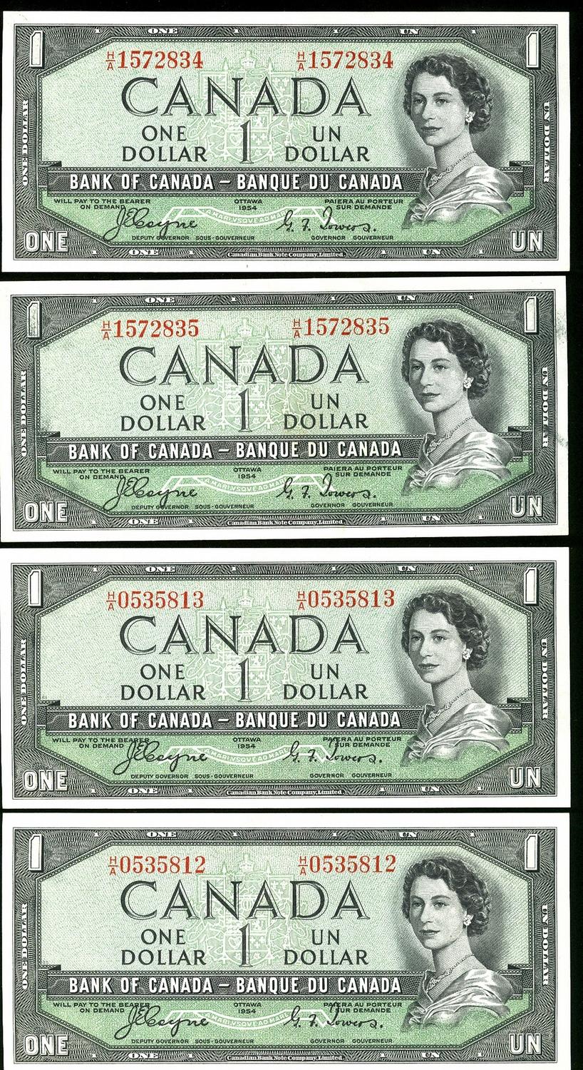 1954 $1 BC-29a #HA1572834/835 & #0535812/813. Lot of 2 pairs of consecutive notes. Original AU to UNC.