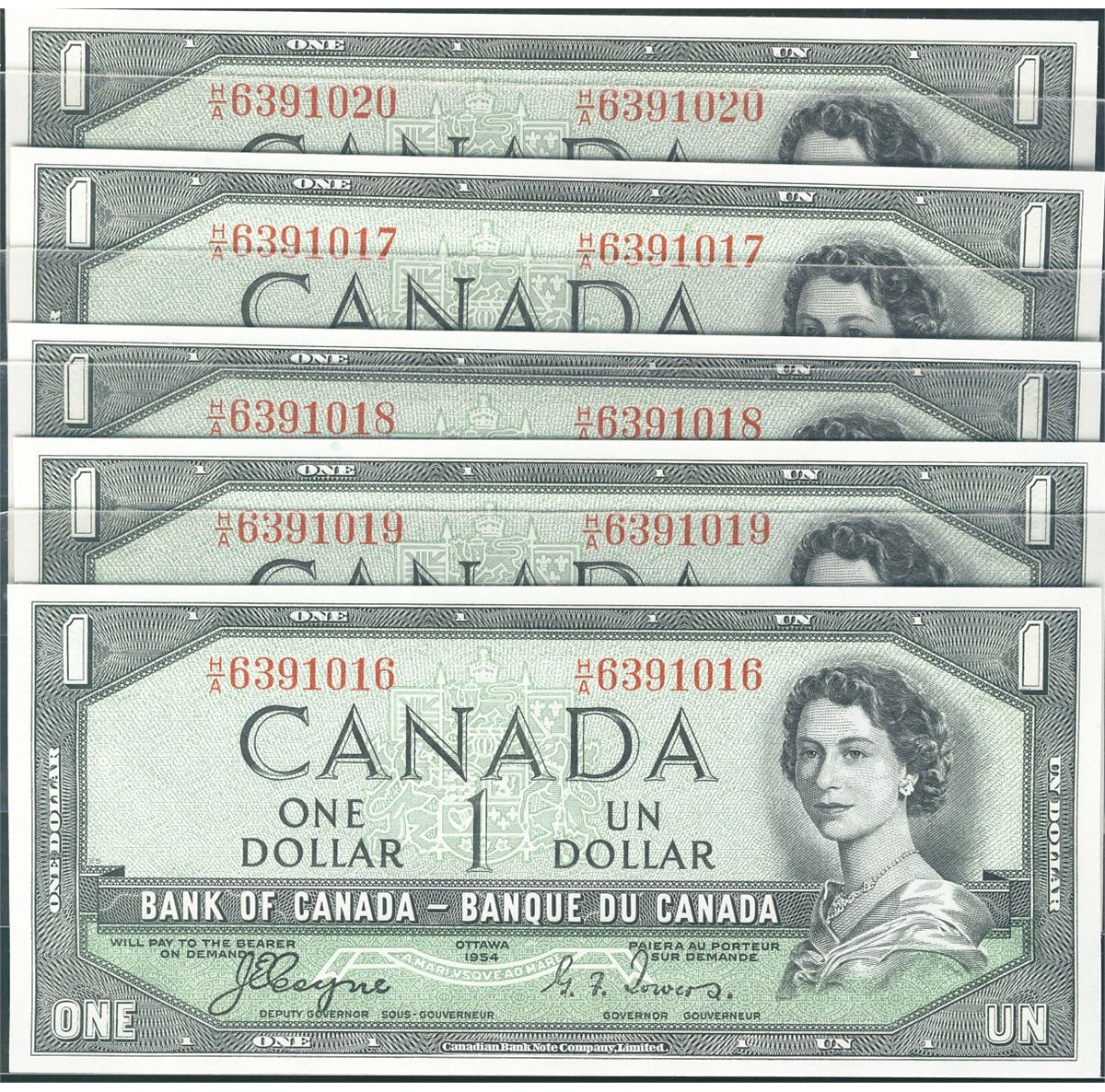 1954 $1 BC-29a #HA6391016-1020. Lot of 5 consecutive Original AU/UNC notes. Minor handling.