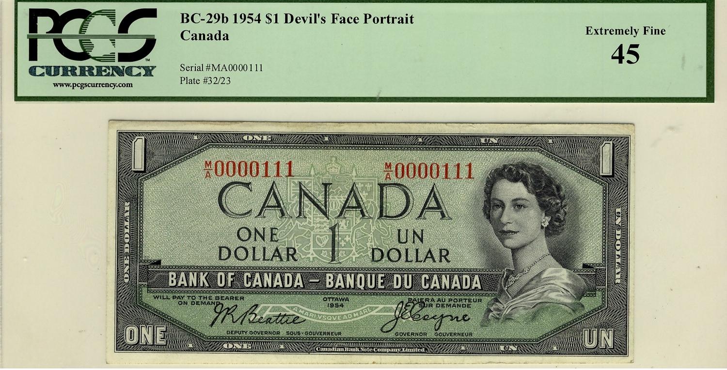1954 $1 BC-29b #0000111 PCGS EF45. Nice low serial number.