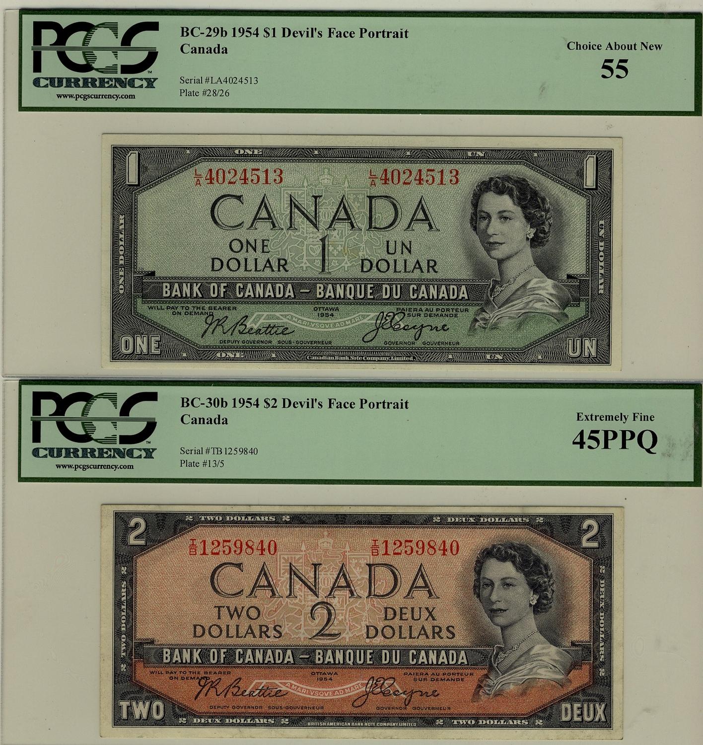 1954 $1 BC-29b AU55 & $2 BC-30b EF45PPQ.  Lot of 2 notes.