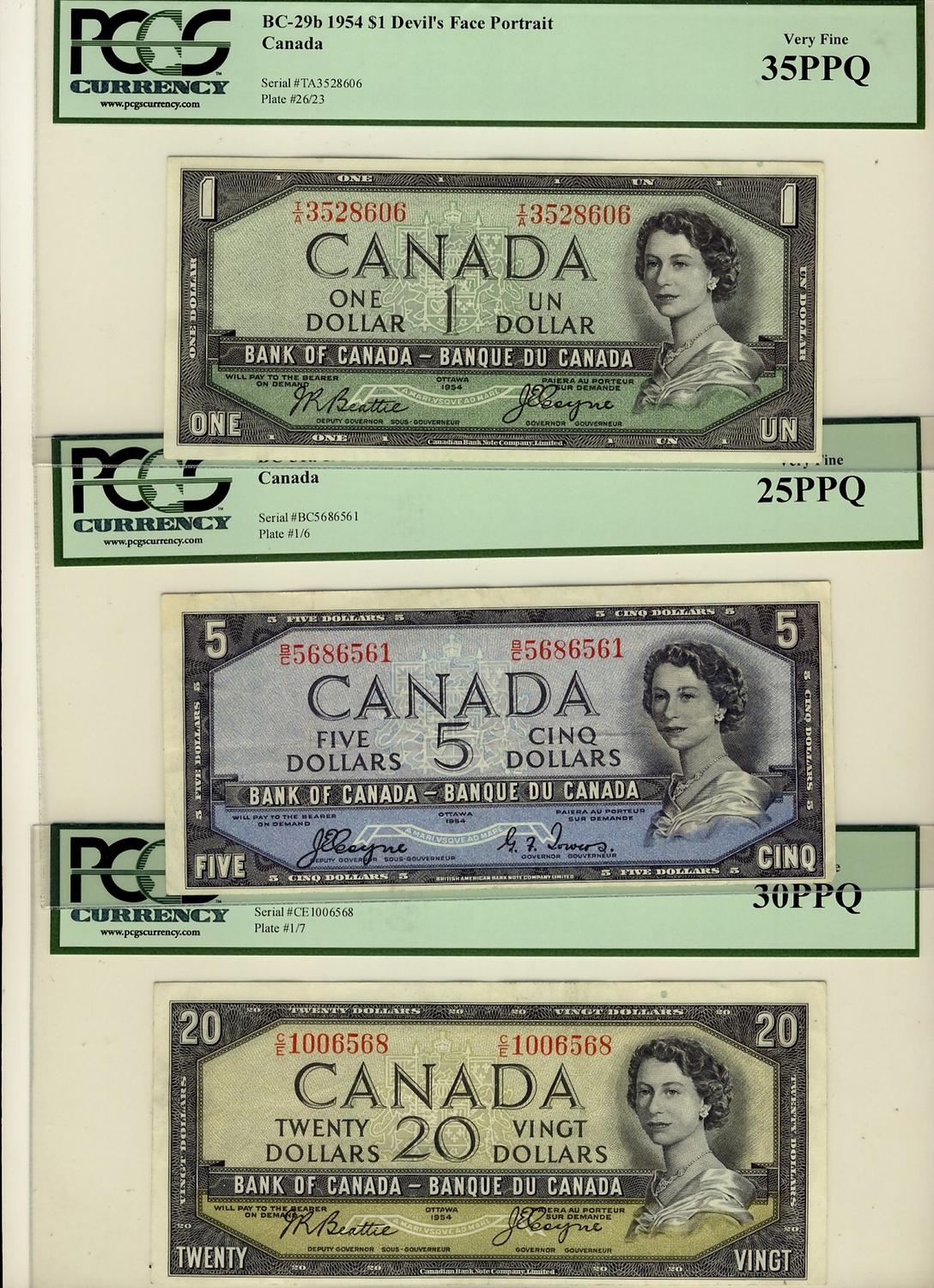 1954 $1 BC-29b #I/A3528606 PCGS VF35PPQ and 1954 $5 BC-31a B/C5686561 PCGS VF25PPQ and 1954 $20 BC-33b #C/E1006568 PCGS VF30PPQ, Lot of 3 notes