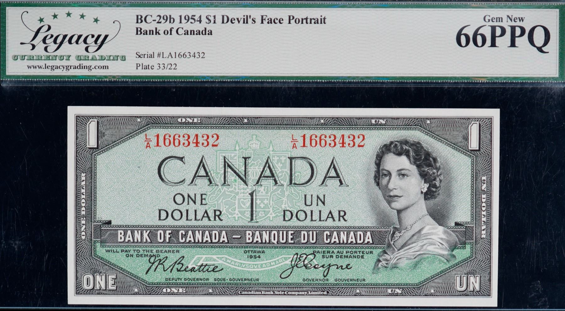 1954 $1 BC-29b #L/A1663432 Legacy Superb Gem Uncirculated-66PPQ Devil's face