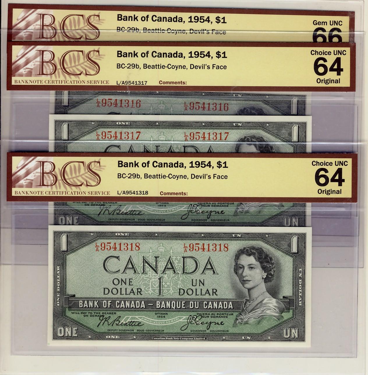 1954 $1 BC-29b #LA9541316/317/318. Lot of 3 BCS graded notes, 1 x Gem UNC66 and 2 x CH UNC64.