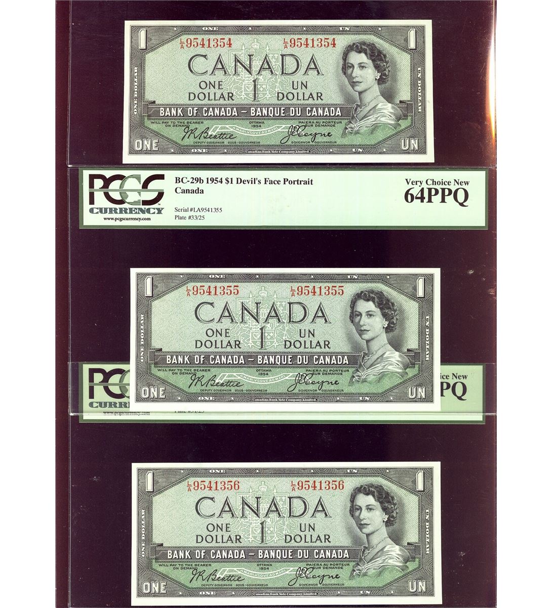 1954 $1 BC-29b #LA9541354-356 PCGS CH UNC64PPQ. Lot of 4 consecutivenotes.