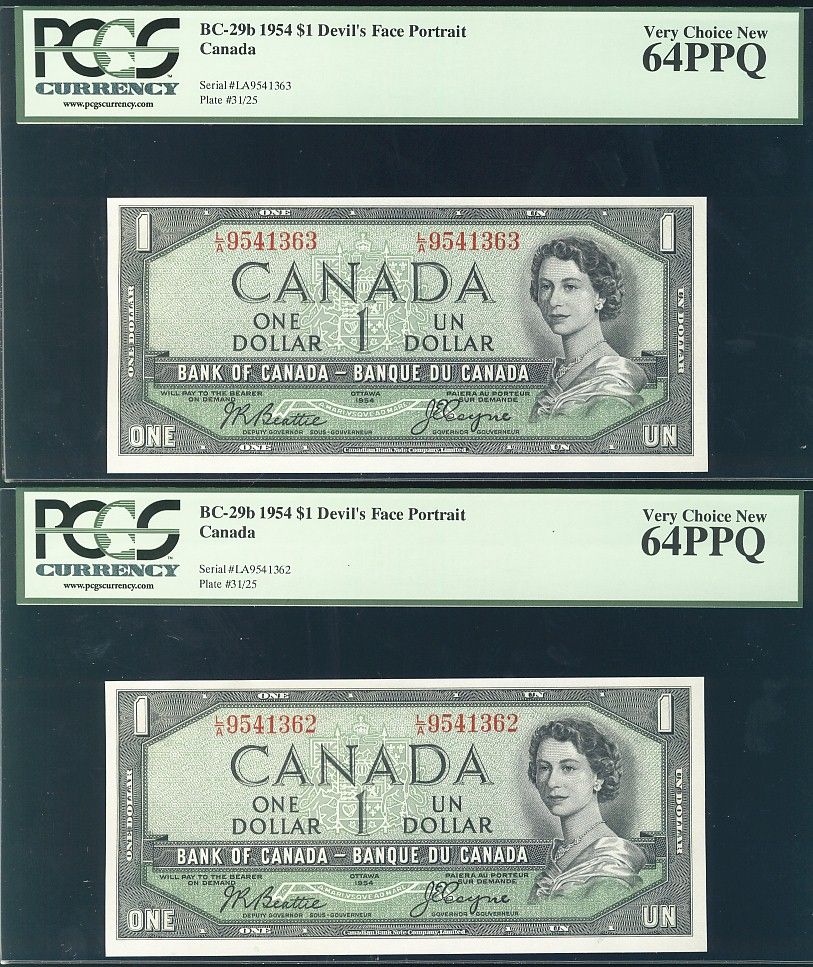 1954 $1 BC-29b #LA9541362/1363 PCGS CH UNC64PPQ. Lot of 2 consecutive notes.