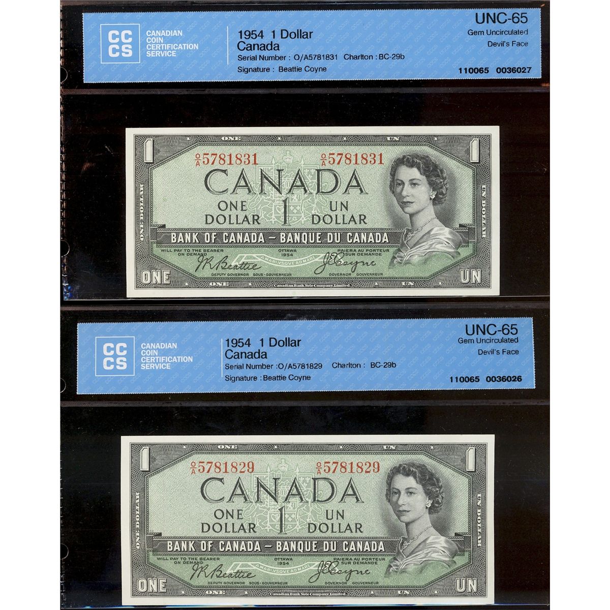 1954 $1 BC-29b #OA5781829 & 1831 CCCS Gem UNC65. Lot of 2 notes