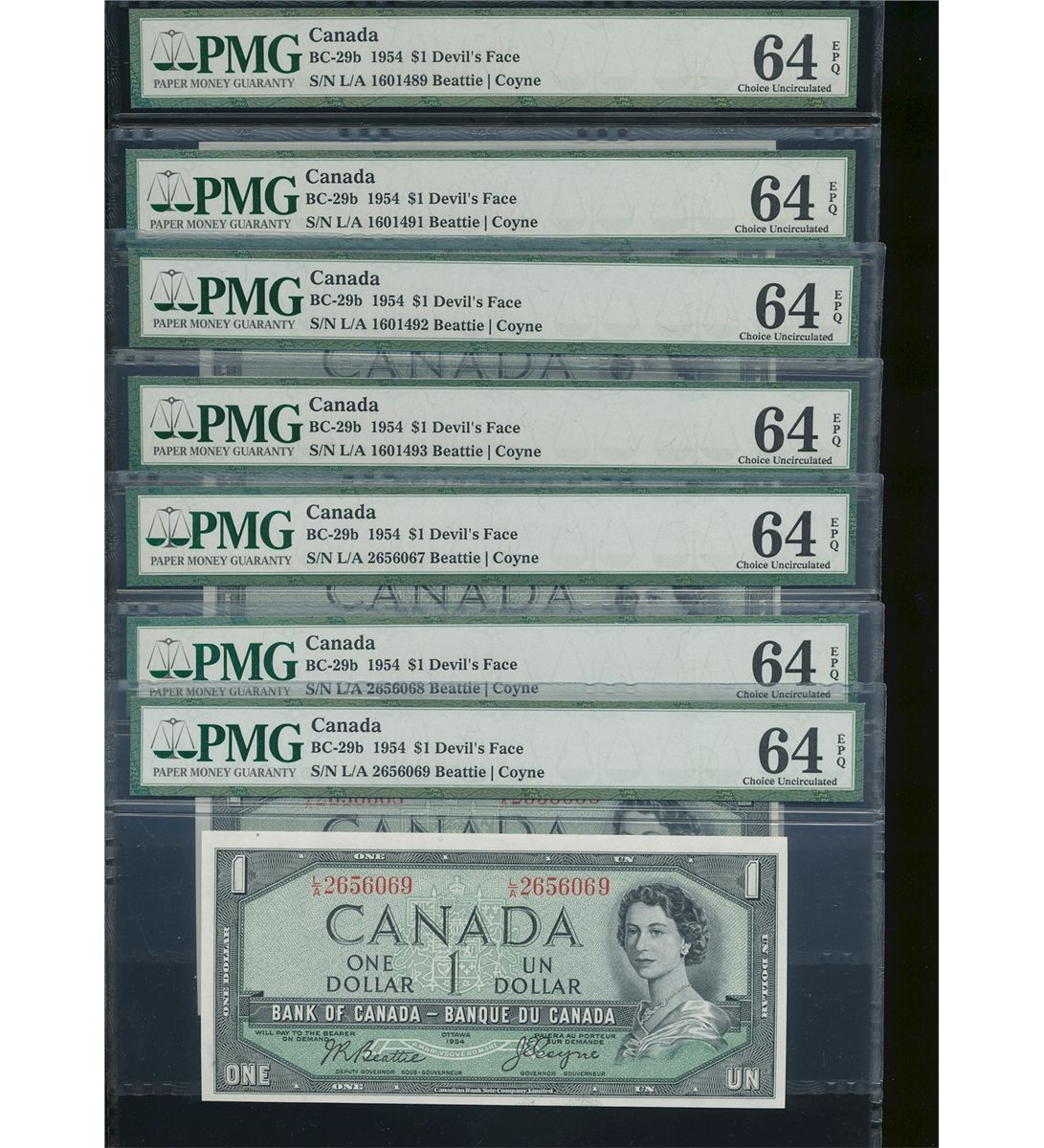 1954 $1 BC-29b, PMG CH UNC64. Lot of 11 notes with some consecutive issues.