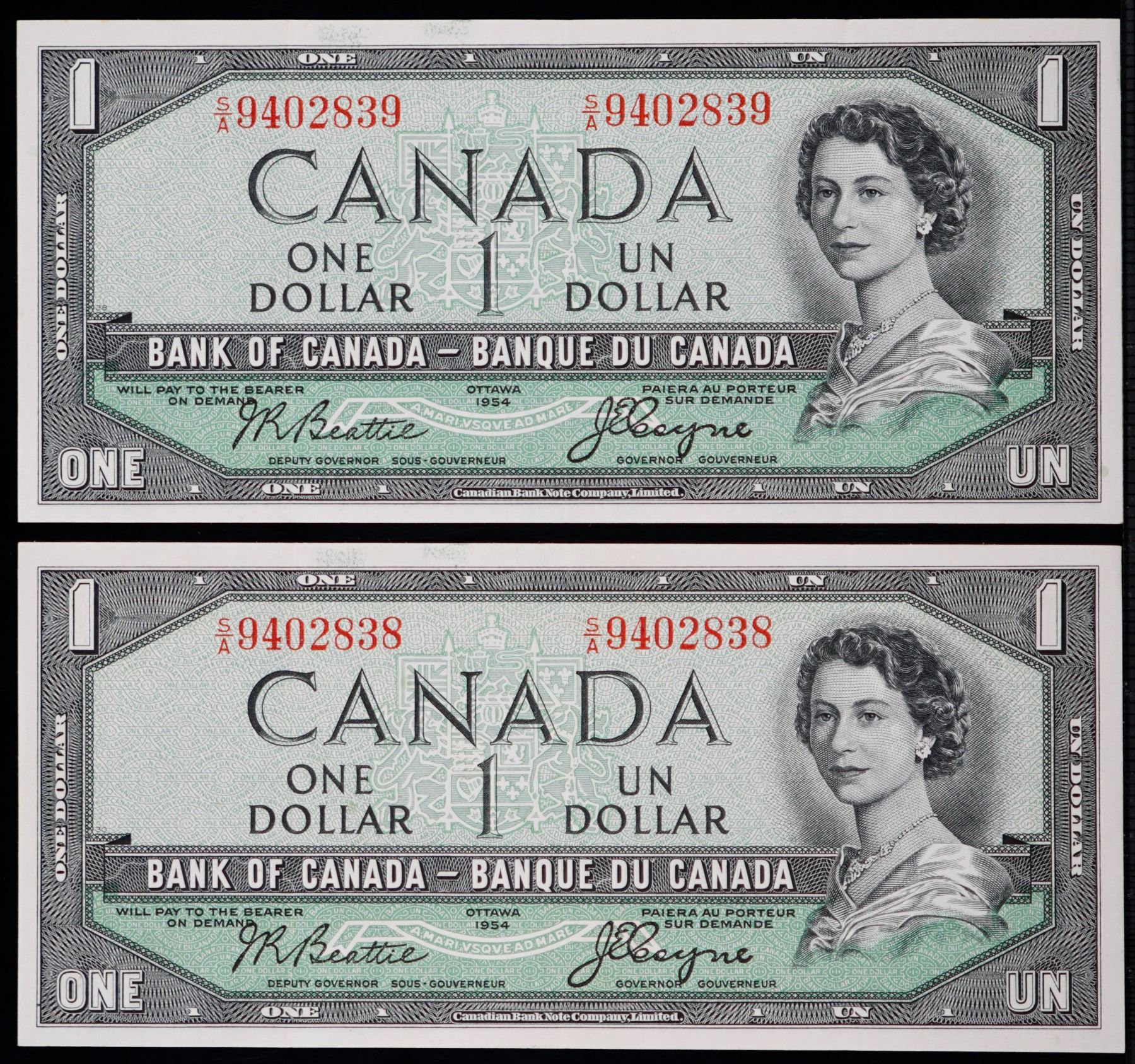 1954 $1 BC-29b #S/A9402838-2839. Lot of 2 consecutive Devil's Face notes in EF condition.