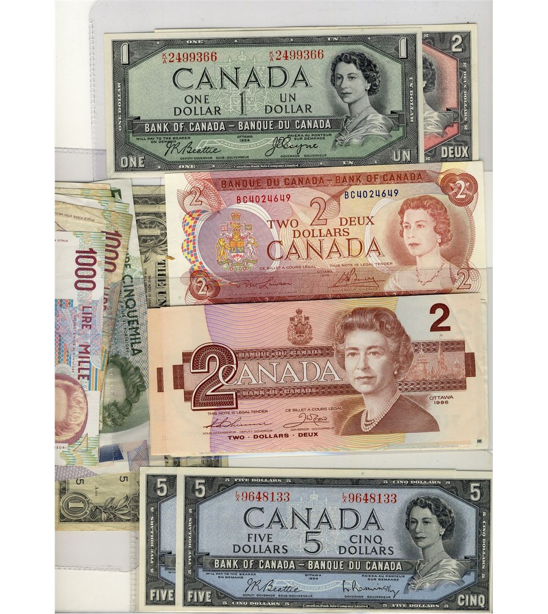 1954 $1 BC-29b VF, $2 BC-38d, $5 BC-39b(2 consec), 1967 $1(3), 1973 $1, 1986 $2(2) along small lot of world notes.