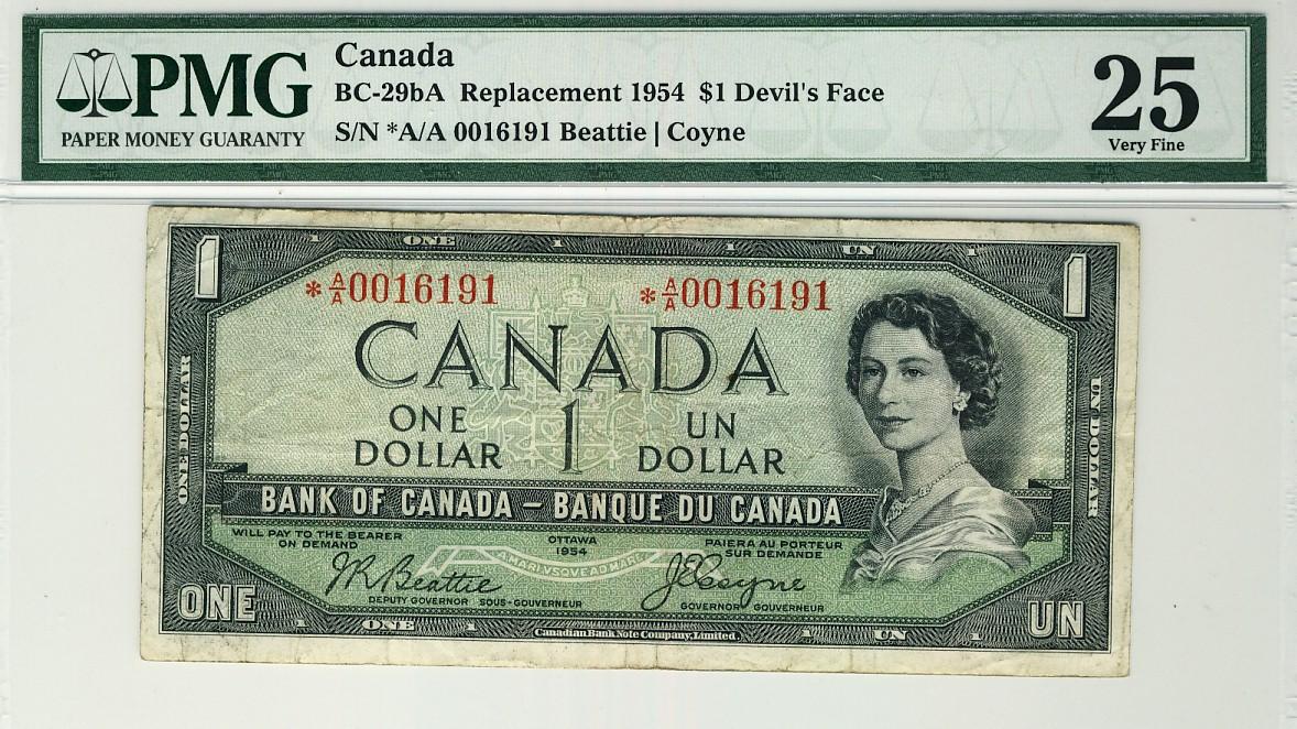 1954 $1 BC-29bA #*A/A0016191 PMG VF25, scarce replacement/devil.