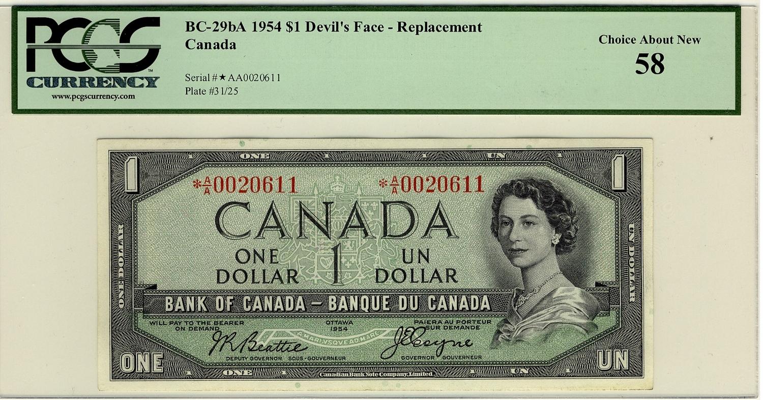 1954 $1 BC-29bA *A/A0020611 PCGS AU58. Vibrant colours with great embossing.