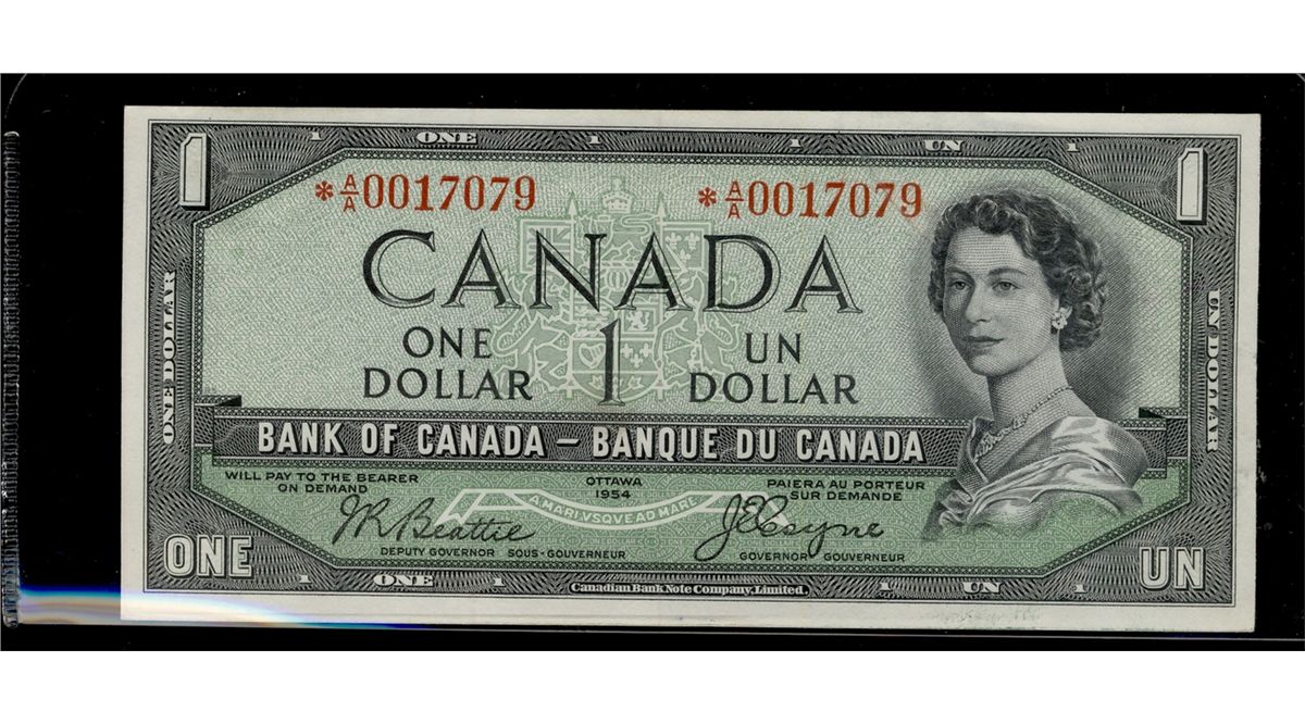 1954 $1 BC-29bA #*AA0017079. Rare DF replacement issue. Sharp original EF.
