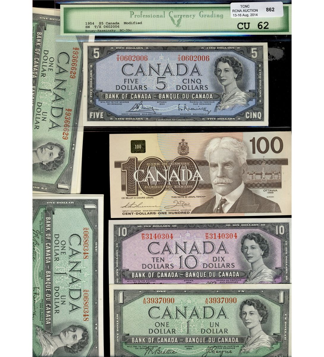 1954 $1 BC-37a(3), BC-37b(4), BC-37bi(1), $5 BC-39c, $10 BC-40a, 1967 $1(6) & 1988 $100. Nice Lot E