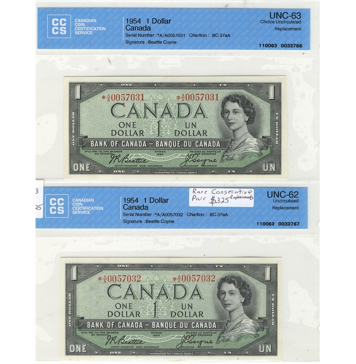 1954 $1 BC-37aA #*AA Consecutive Pair Replacements CCCS UNC-62 AND UNC-63.